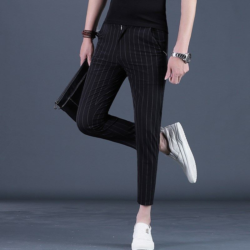 夏季裤子男九分裤男士休闲裤潮流修身小脚条纹9分薄款黑色男裤25
