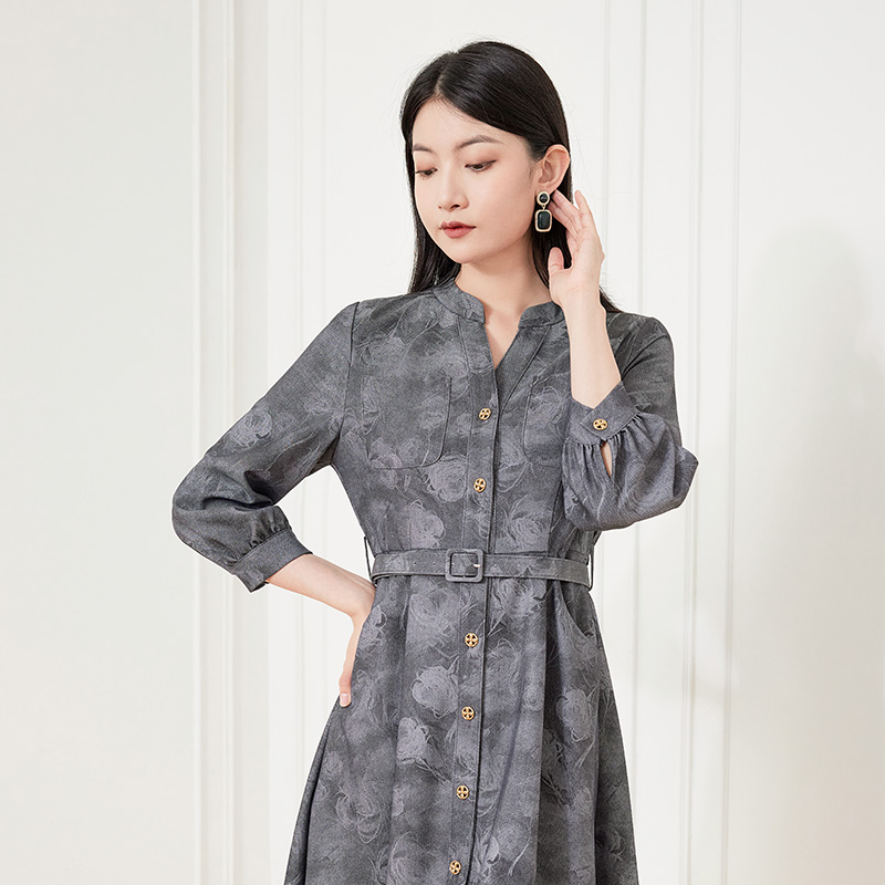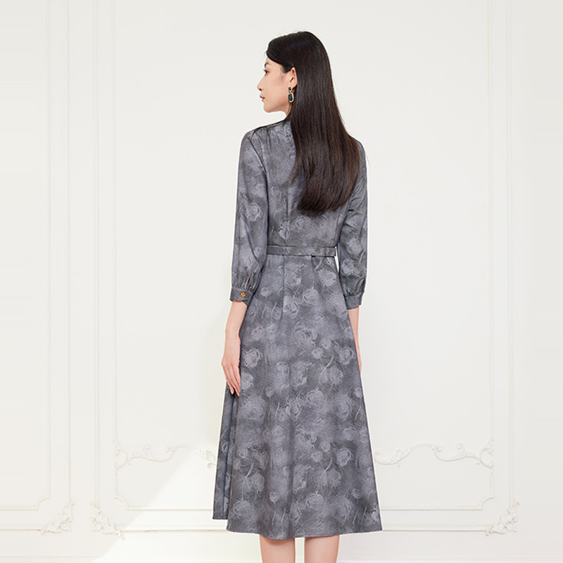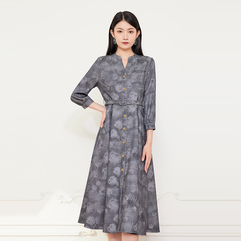 希区瑞普学院风衬衫连衣裙气质印花a字伞裙春秋季中长款长袖收腰