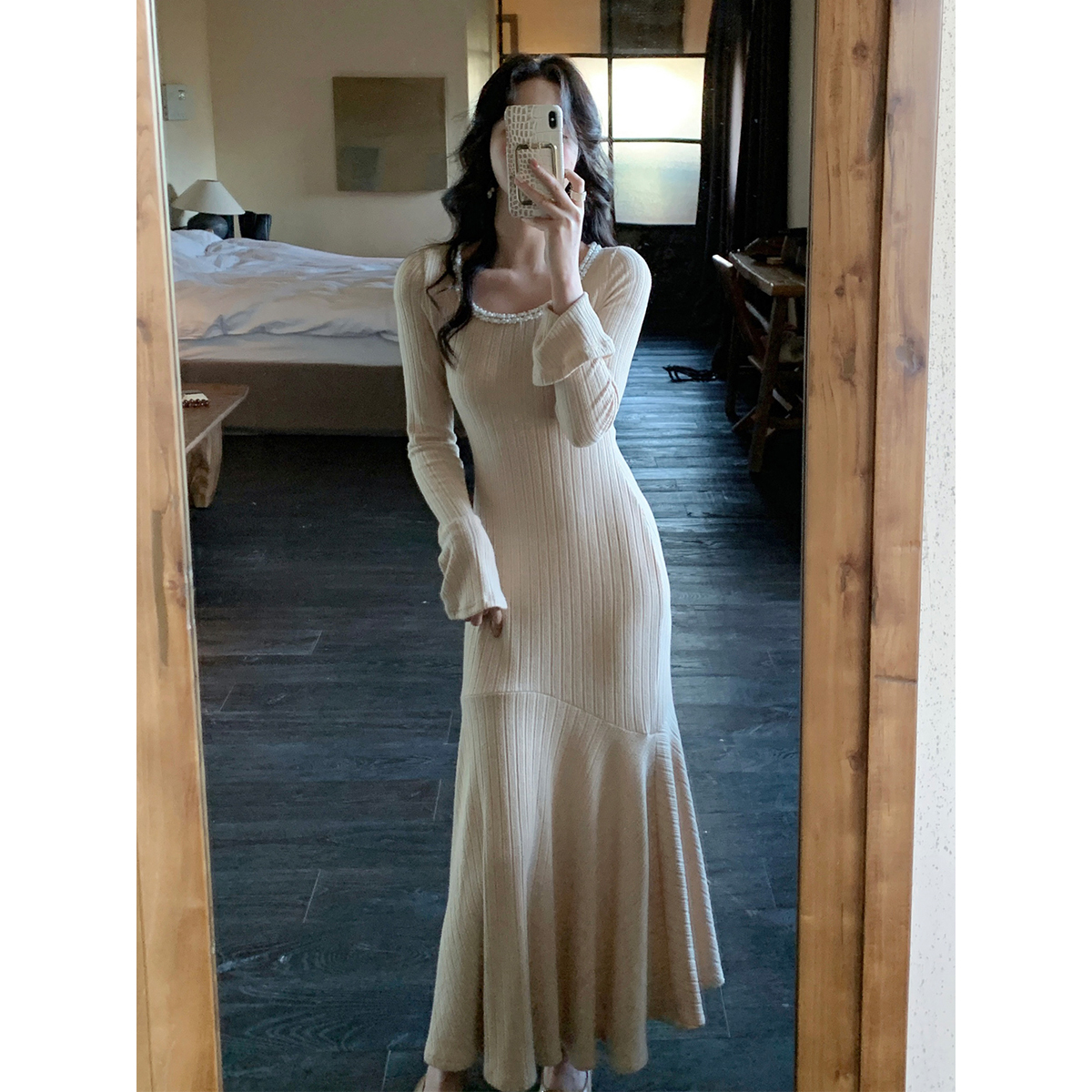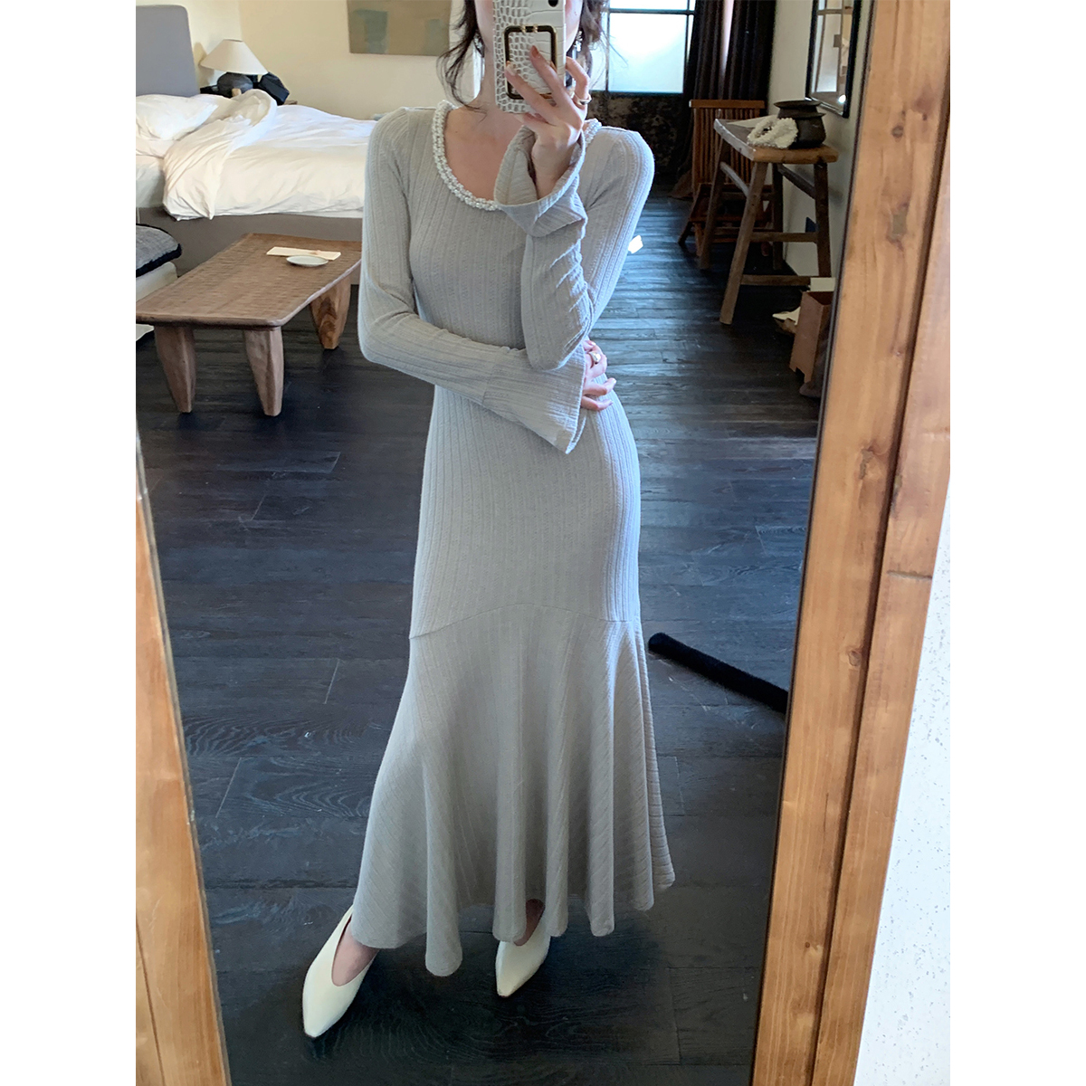 SYT自制 珍珠圆领修身鱼尾针织连衣裙女冬拼接收腰喇叭袖A型长裙