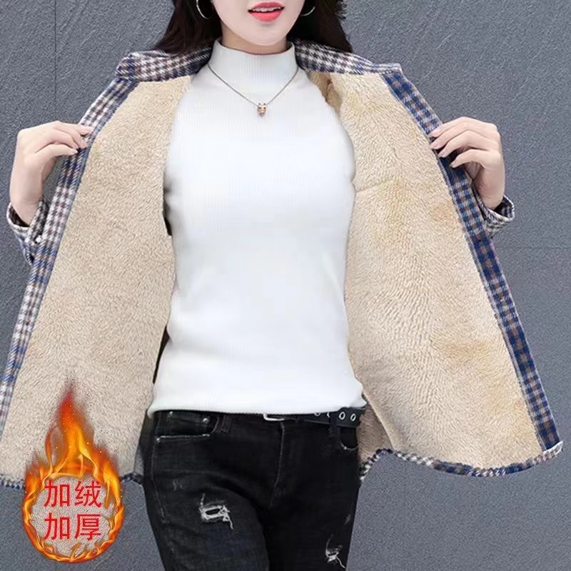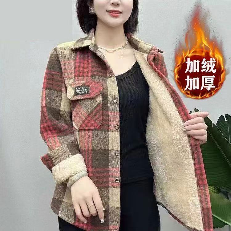 秋冬新款女士保暖衬衫妈妈装秋季外套女加绒加厚衬衣格子厚款上衣