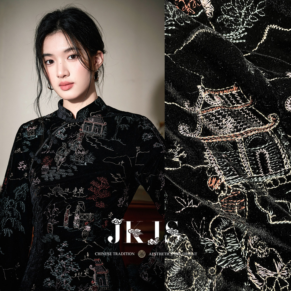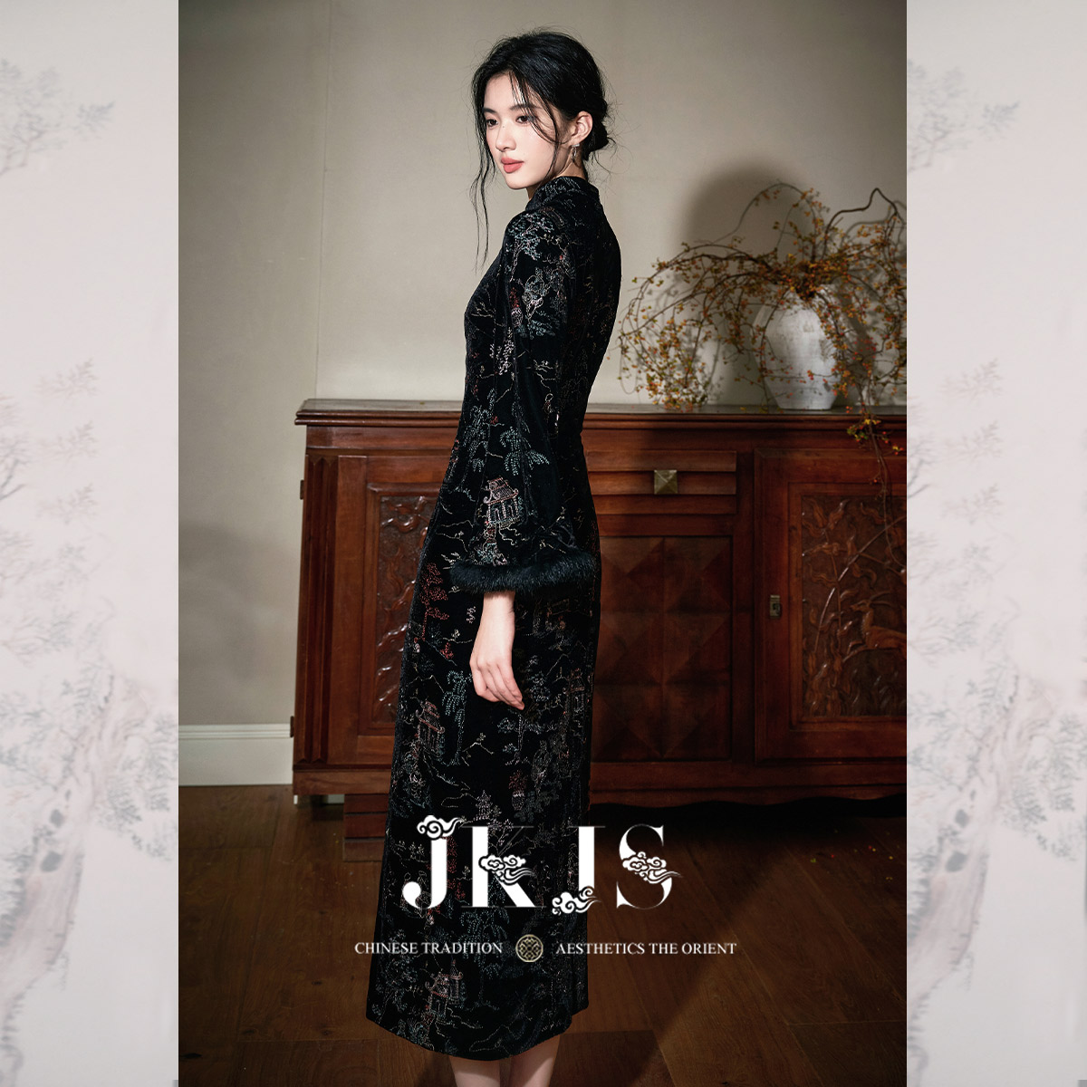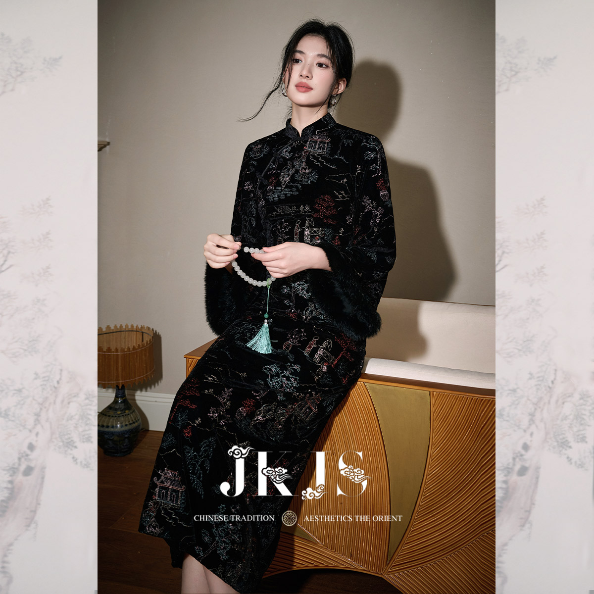 JKJS【郁斓冬】丝绒刺绣 新中式长裙秋冬连衣裙长款加厚气质裙子