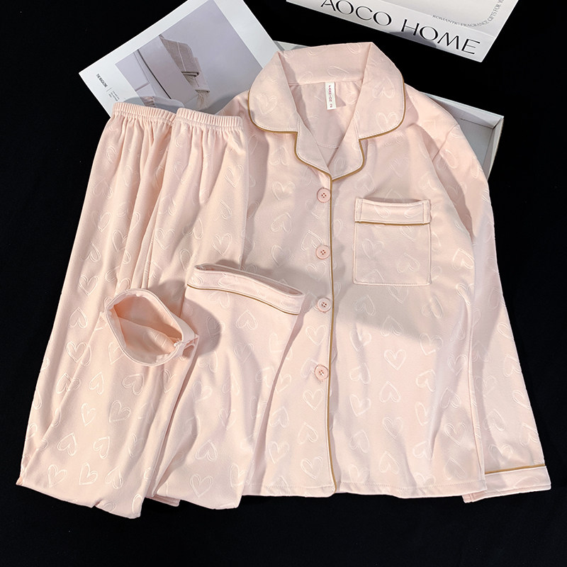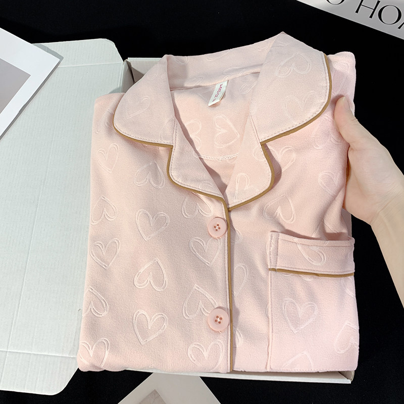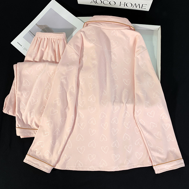 秋冬季开衫长袖德绒睡衣女士翻领提花桃心粉色保暖家居服套装冬天