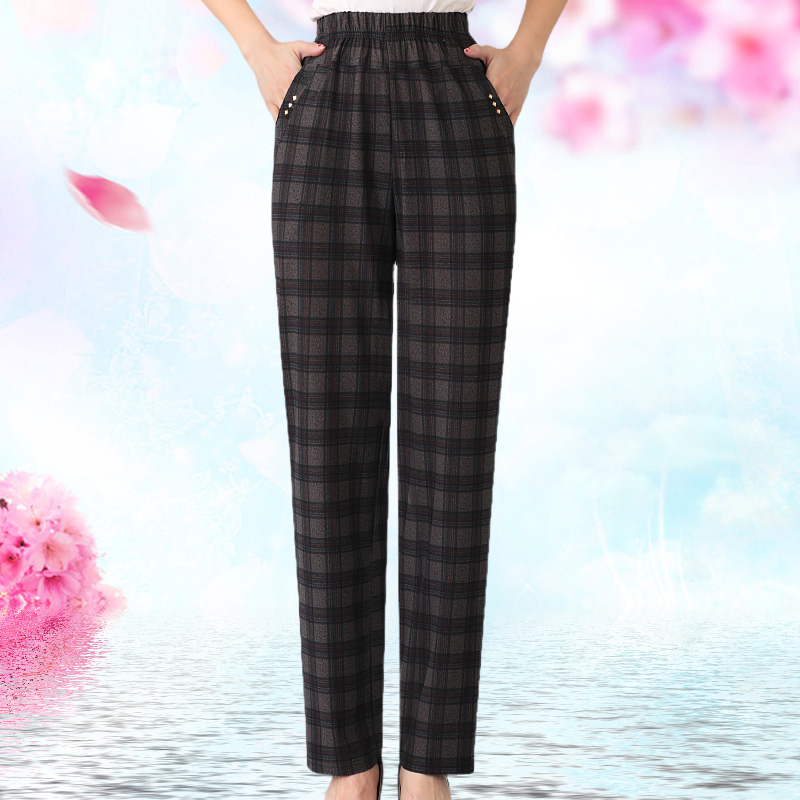 中老年女裤妈妈裤子夏季款弹力小直筒裤高腰深裆休闲格子薄款裤子