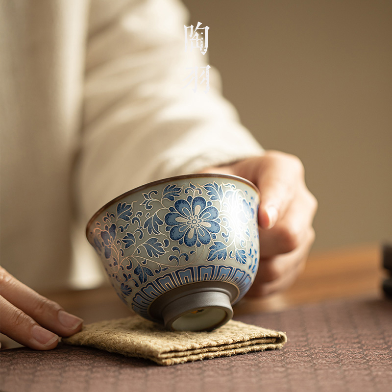 汝窑缠枝莲银线主人杯陶瓷开片可养高档个人专用功夫茶具品茗杯