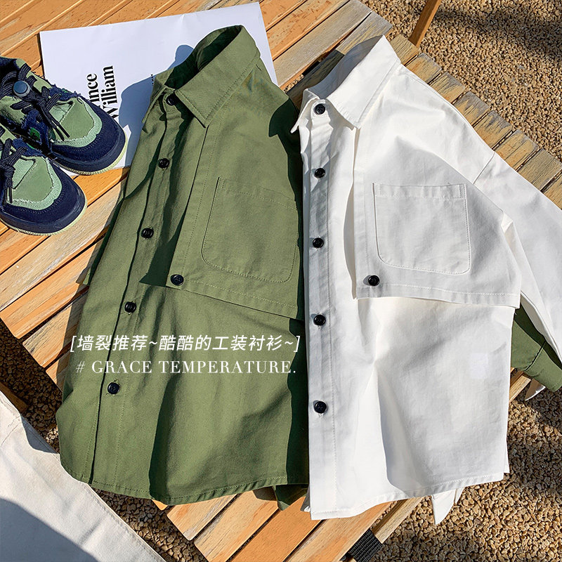 小o宝okids 男童衬衫春装新款韩范中大儿童白色工装风衬衣宝宝外
