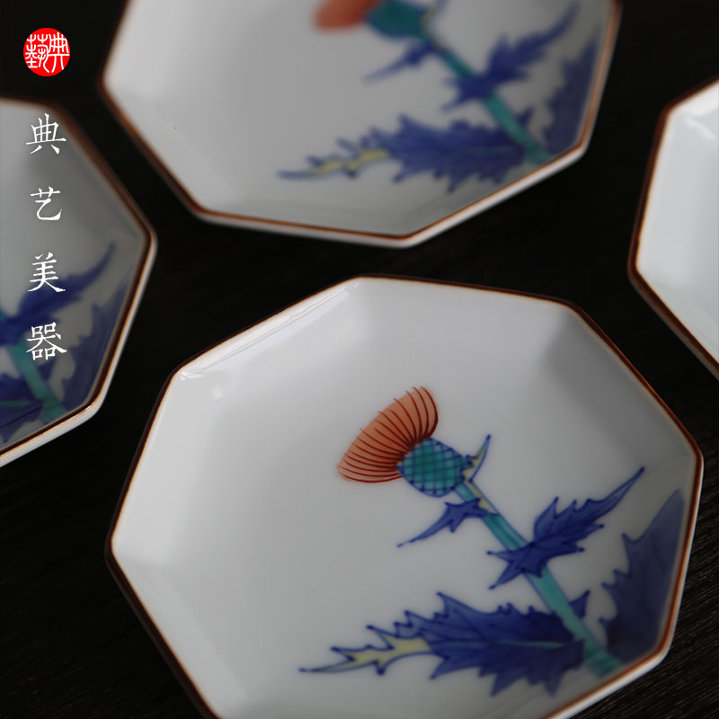 日瓷宫内厅御用达十三代常辻陸纯手绘染付赤绘六边碟杯垫杯托皇室