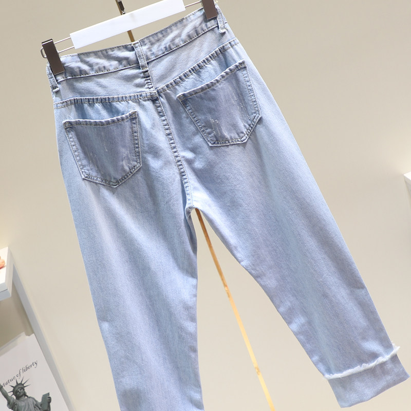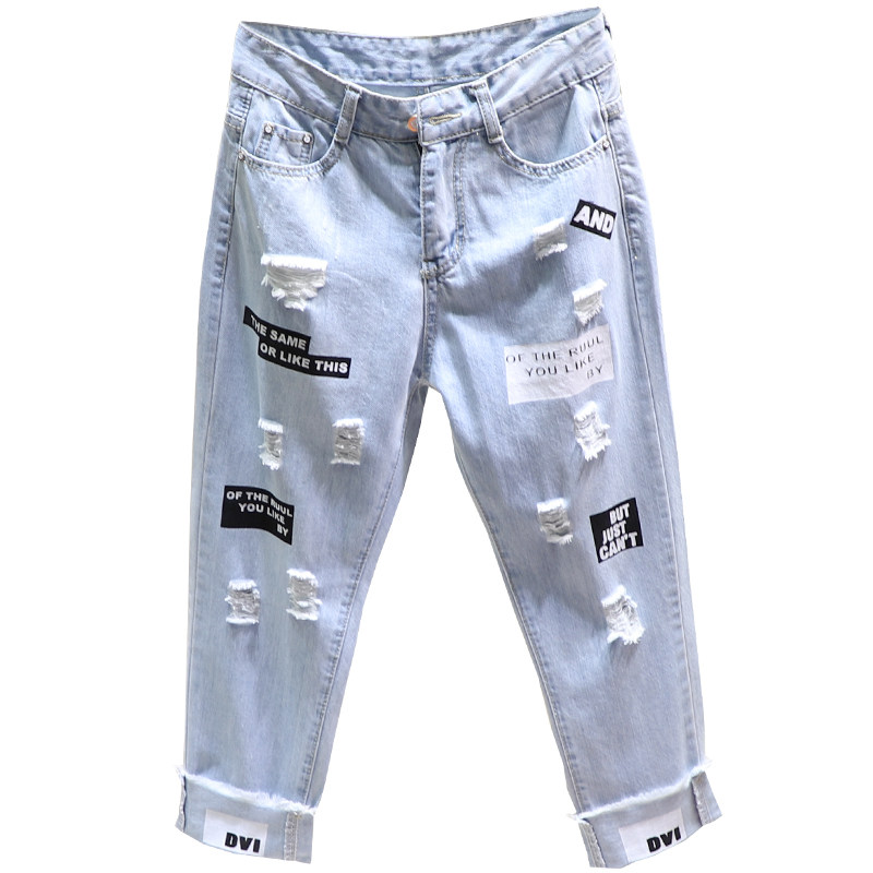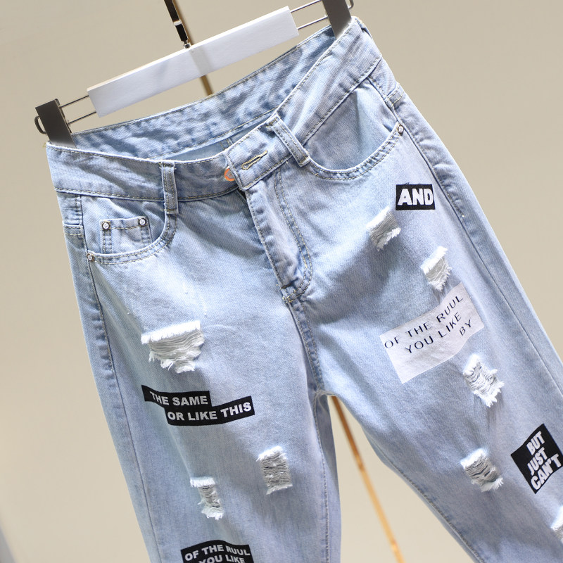 浅色烂破洞牛仔裤女宽松直筒翻边字母印花乞丐高腰bf风九分垮裤子