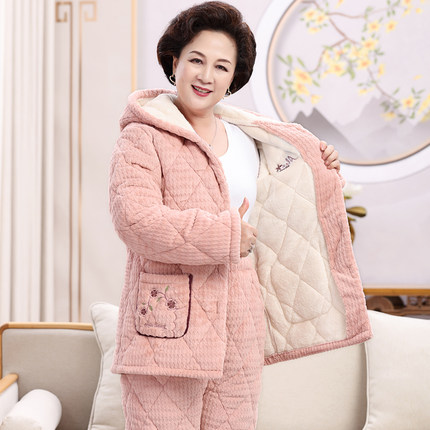 中老年睡衣女士珊瑚绒三层夹棉加厚加绒连帽套装中老人保暖家居服