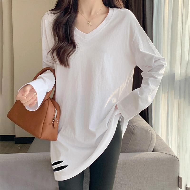 2025秋新款中长款白色v领长袖t恤女下摆破洞宽松百搭打底衫0929u