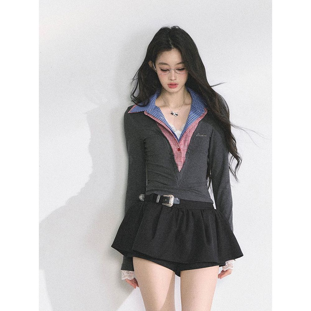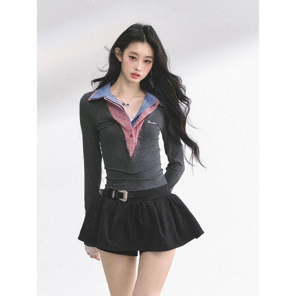 东京优等生 假两件美式长袖辣妹T恤女夏收腰设计感上衣裙裤套装