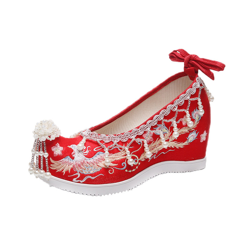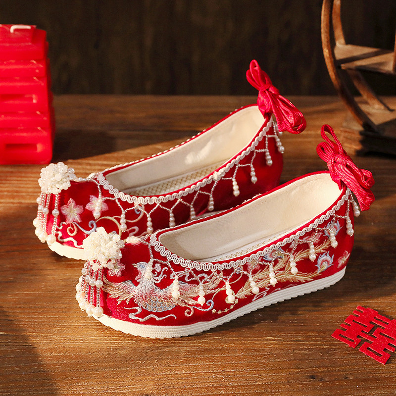 秀禾婚鞋原创汉服鞋子女内增高古风红色中式新娘鞋珍珠流苏绣花鞋