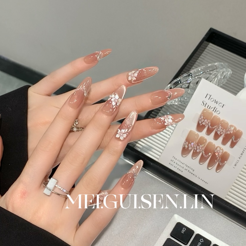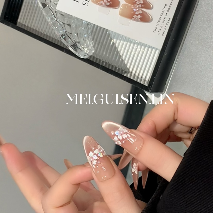 玫瑰森林绮梦庄园手作穿戴甲温柔渐变花朵猫眼美甲长款法式显白甲