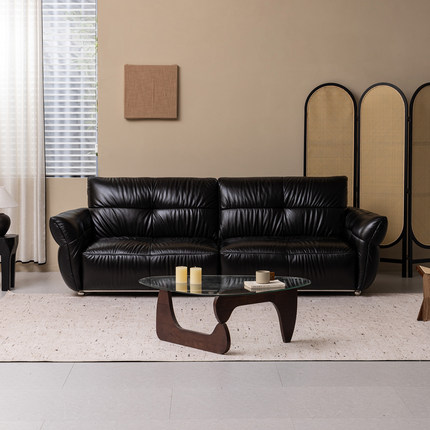支吾黑珍珠皮艺真皮沙发客厅直排黑色中古风轻奢高级感2025新款