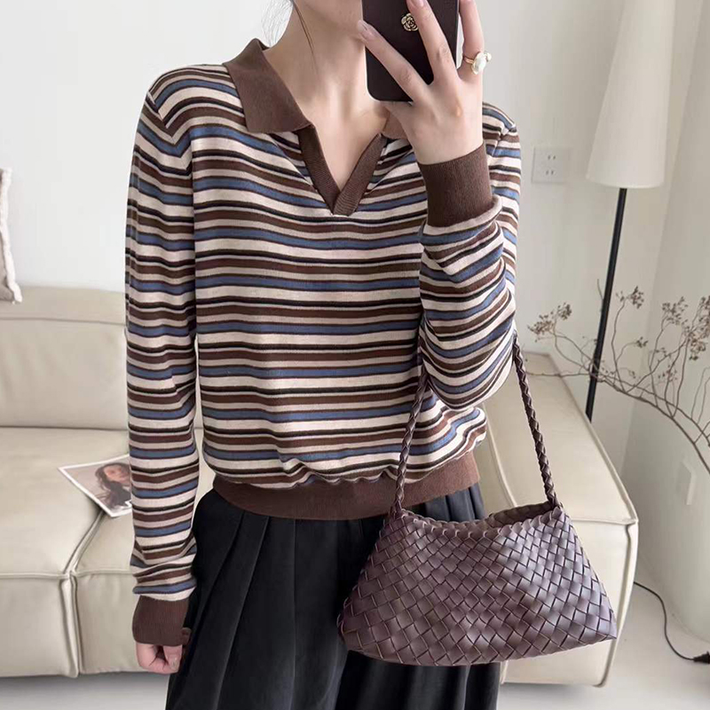 2025新款POLO领条纹针织衫女V领长袖毛衣外套宽松显瘦百搭上衣潮