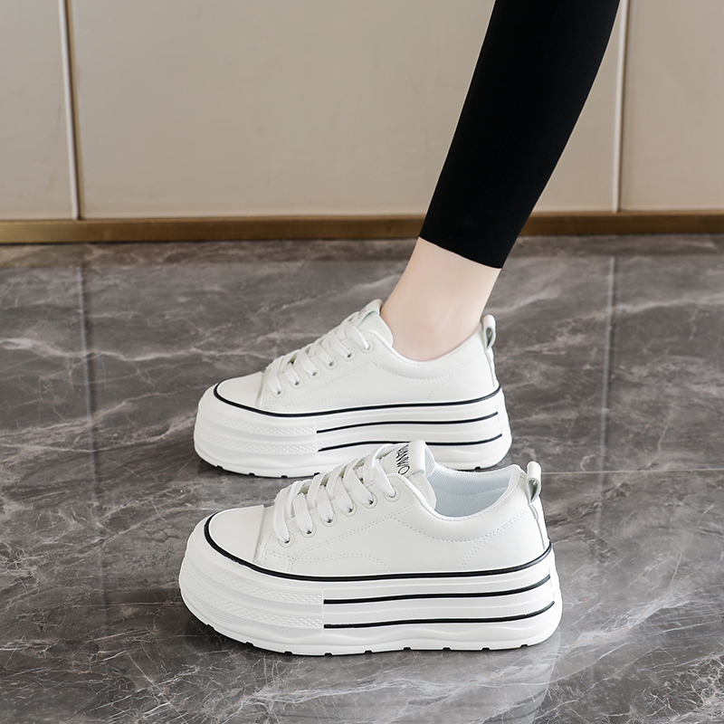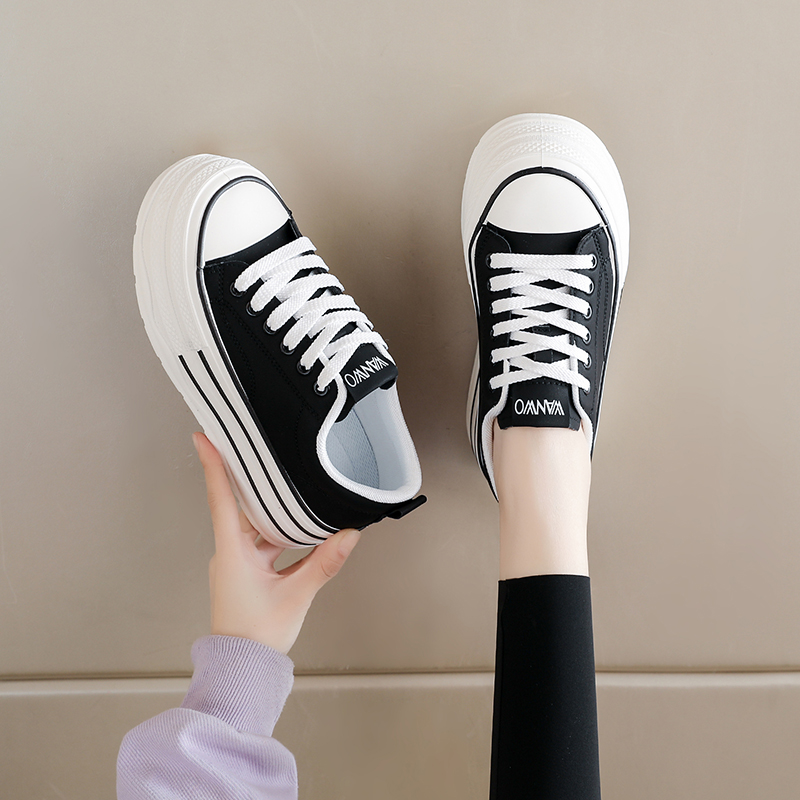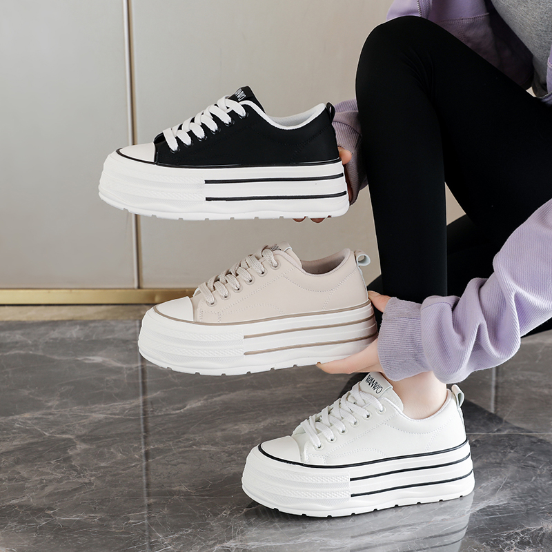 厚底黑色帆布鞋女2025新款秋季增高运动松糕板鞋初中生皮面小白鞋