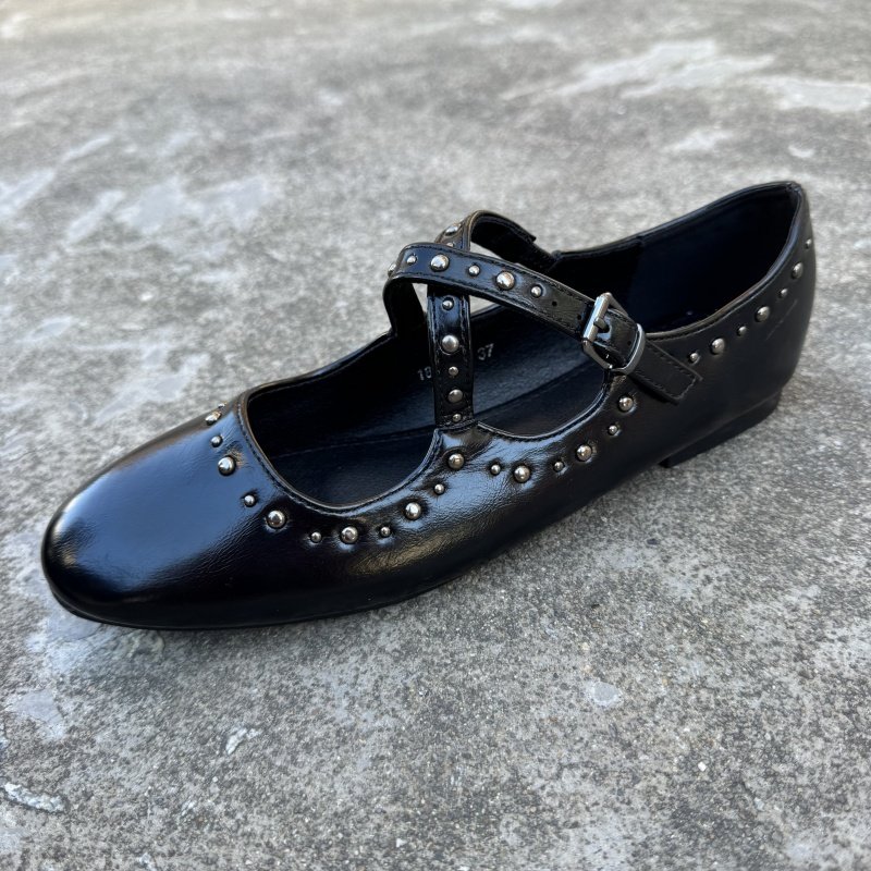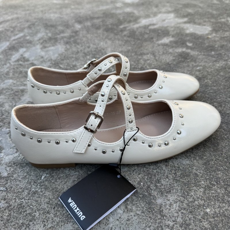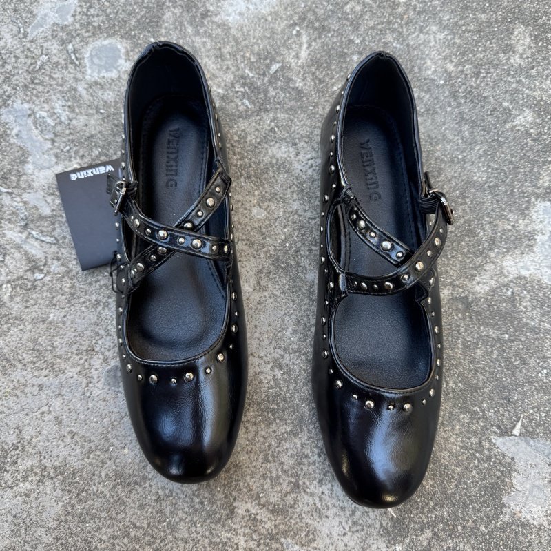 外贸大码鞋铆钉玛丽珍小皮鞋浅口新款夏季通勤一字带单鞋平底女鞋