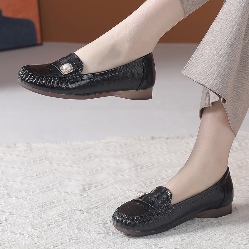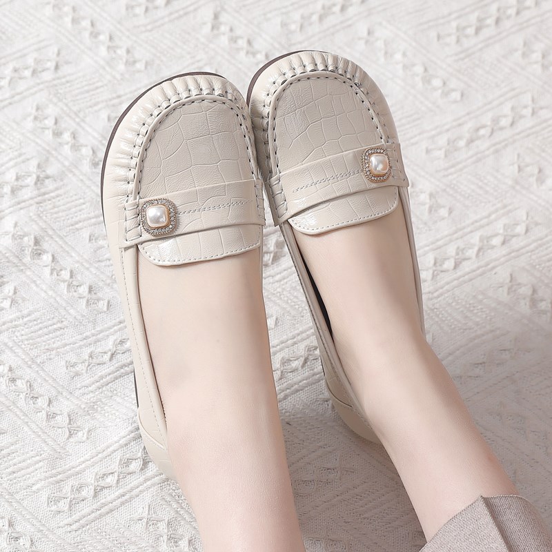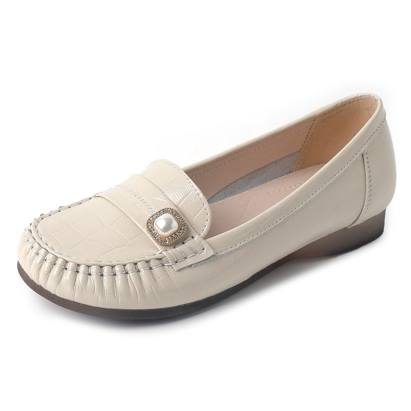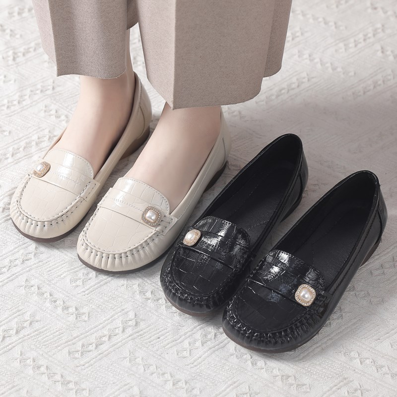 真皮平底单鞋春夏漆皮妈妈鞋休闲浅口豆豆鞋中老年防滑平跟女皮鞋