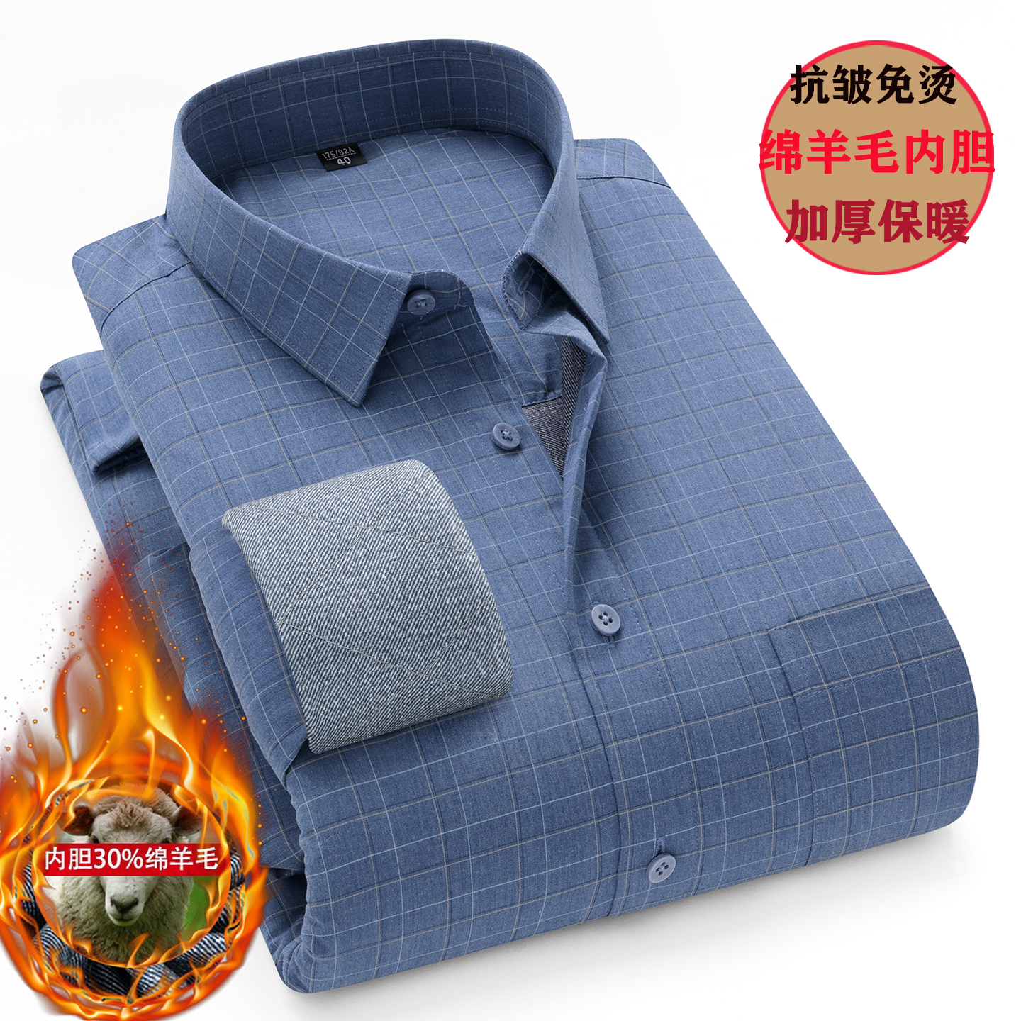 保暖衬衫男长袖加厚羊绒衫纯羊毛内胆爸爸装秋冬季中老年衬衣免烫