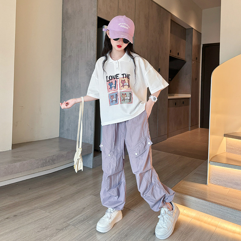 女童套装夏装2025新款儿童时髦薄款工装裤女大童Polo领t恤两件套