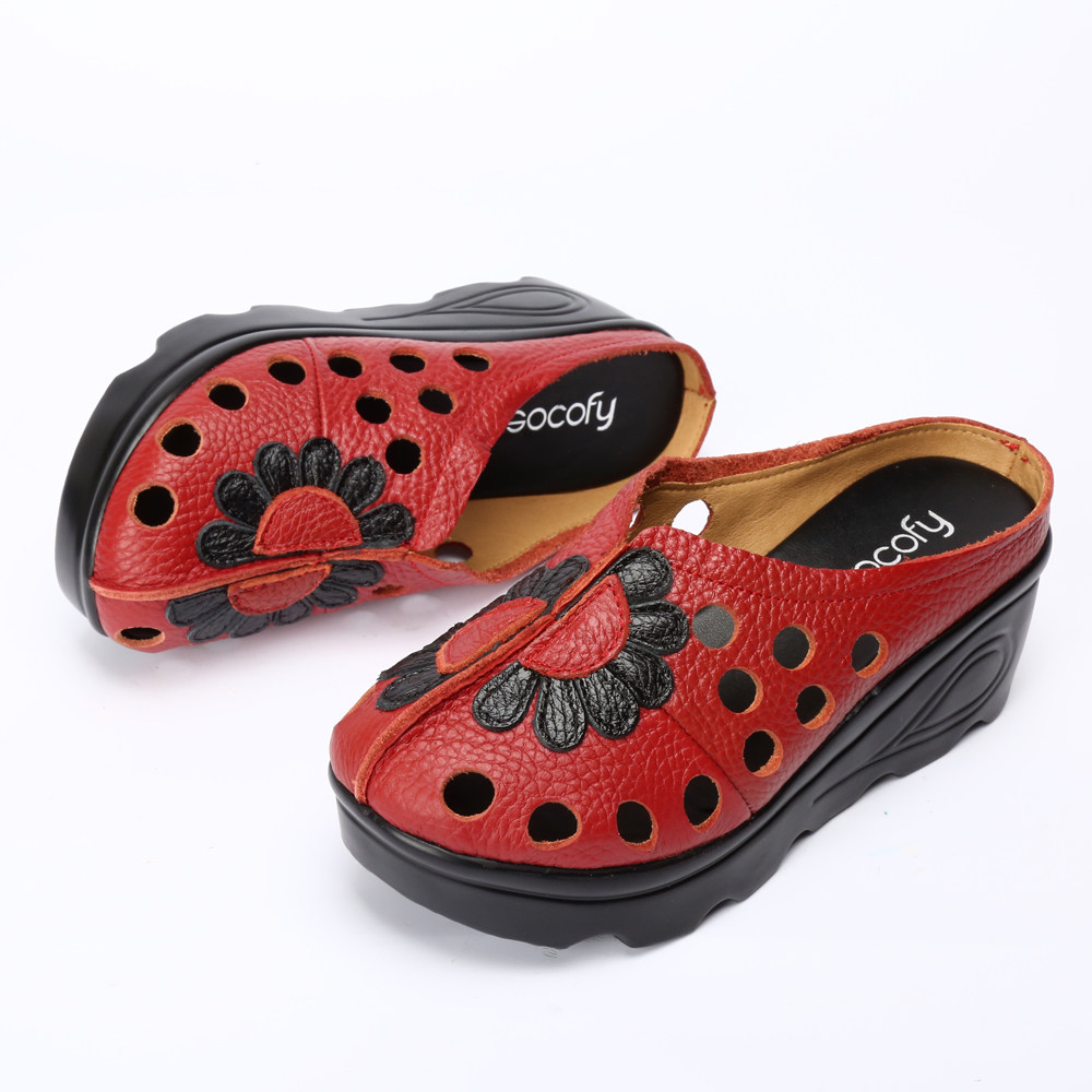 拖鞋女夏2019新款民族风外出穿坡跟包头松糕厚底复古真皮凉拖鞋