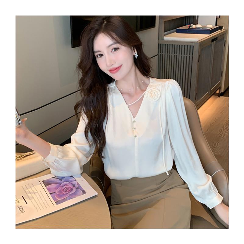 2025春季新款衬衫V领韩版百搭上衣钉珠长袖衬衫女士小衫雪纺衫女