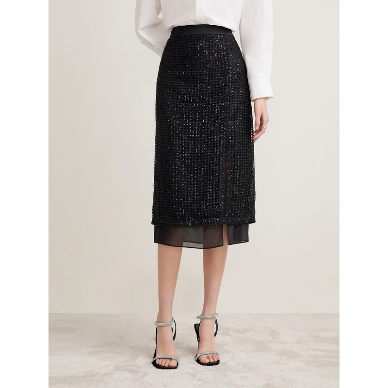 Goodland美地夏季法式优雅粼光珠片开衩修身铅笔半身裙