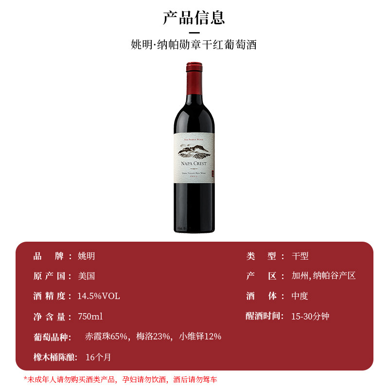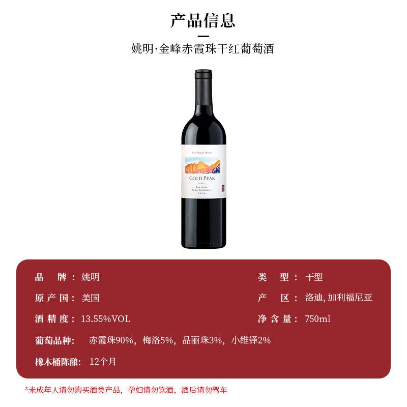 姚明·金峰梅洛干红葡萄酒组合 加州原瓶进口红酒 官方旗舰店正品