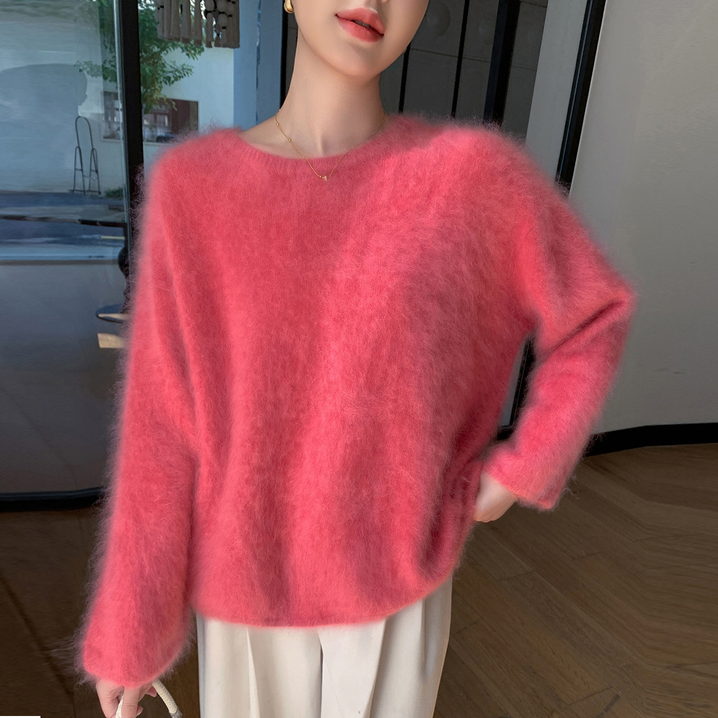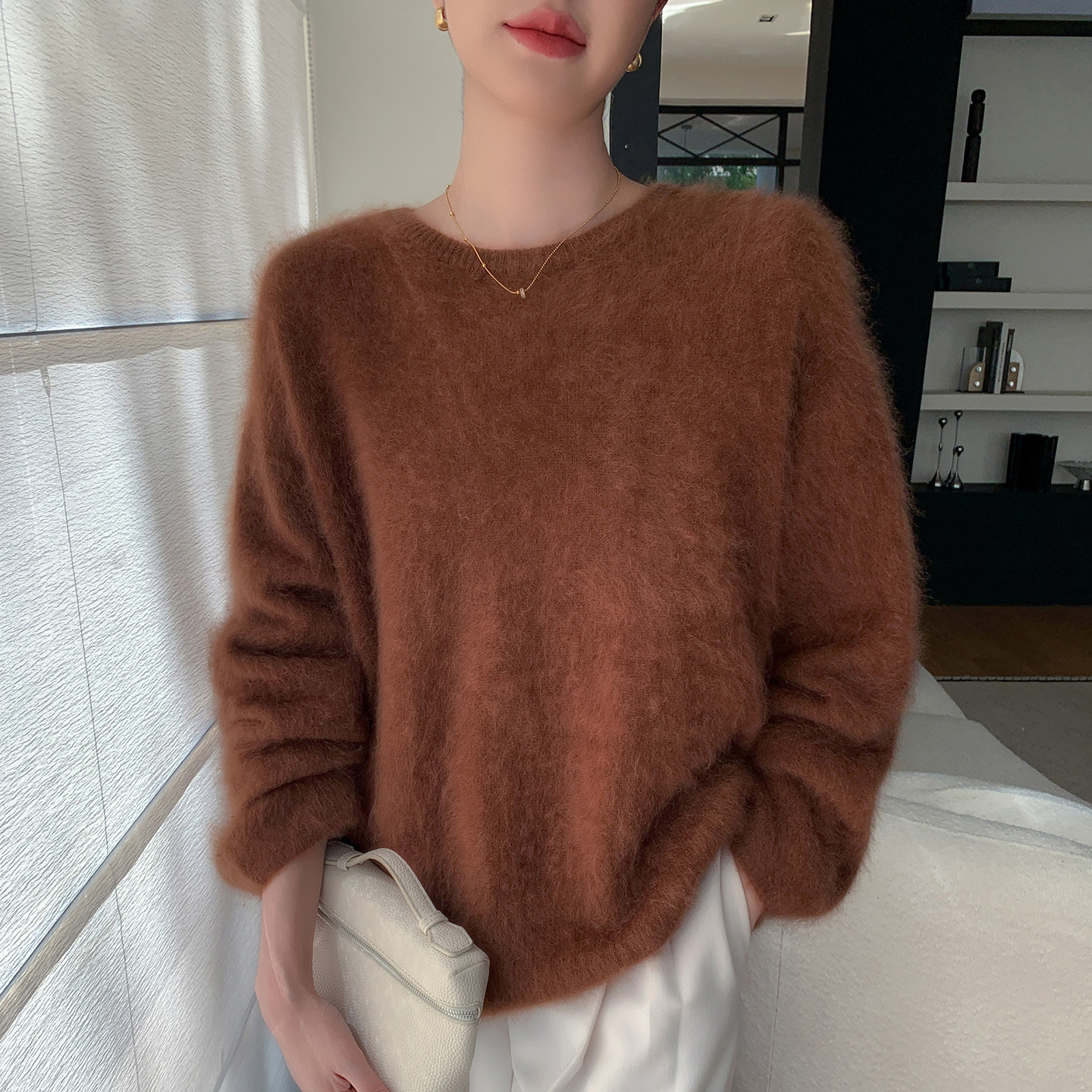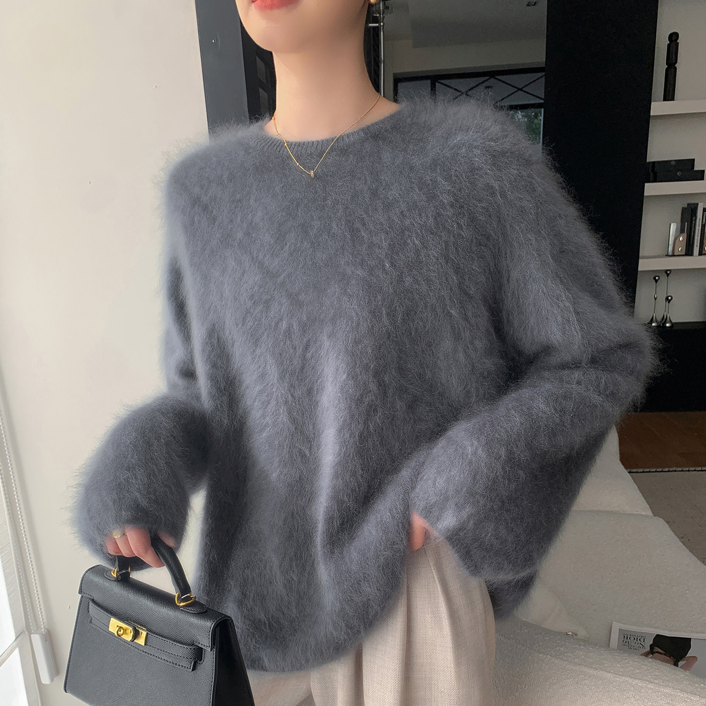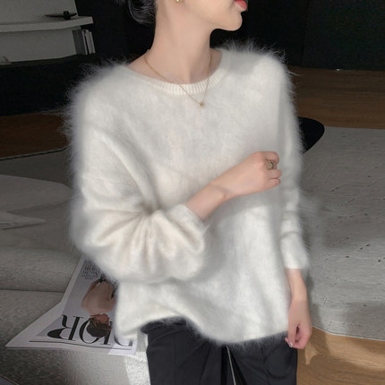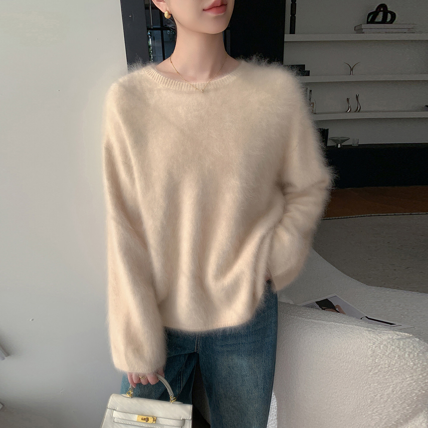 baby小山羊绒衫针织拉绒长袖毛衣女圆领上衣宽松慵懒加厚羊毛打底