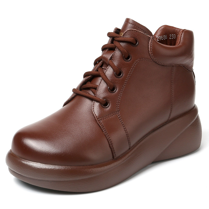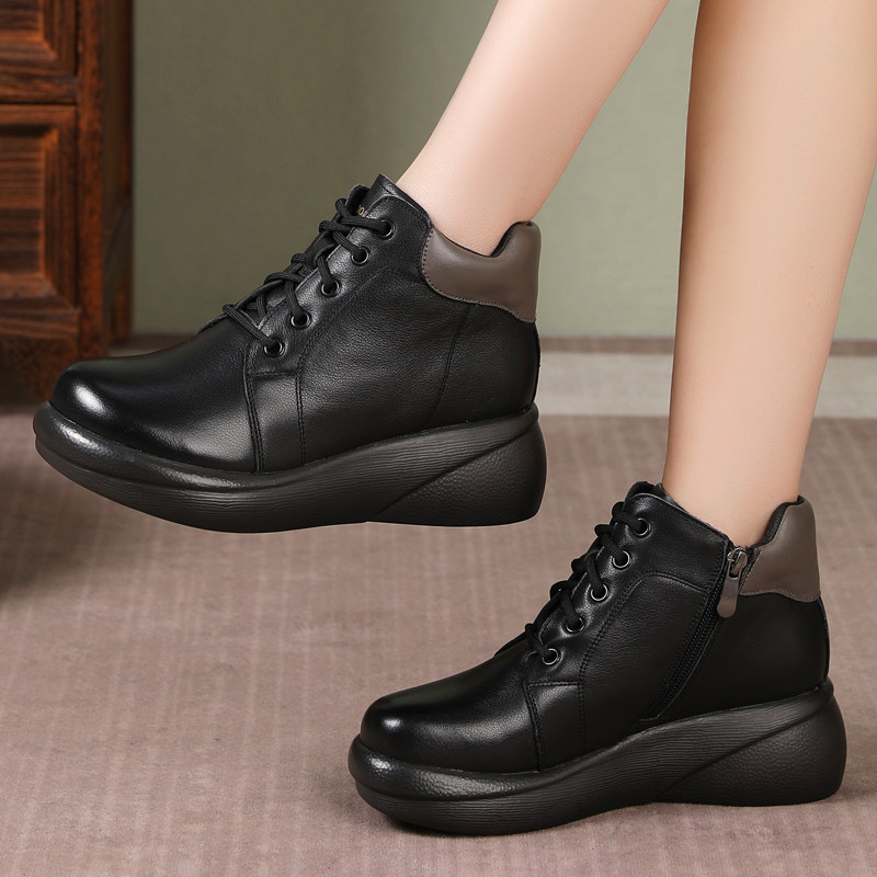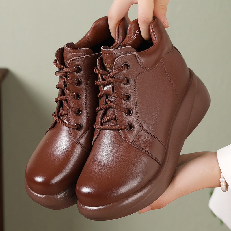 真皮厚底短靴2025秋冬百搭松糕底马丁靴大码圆头女靴系带加绒棉鞋