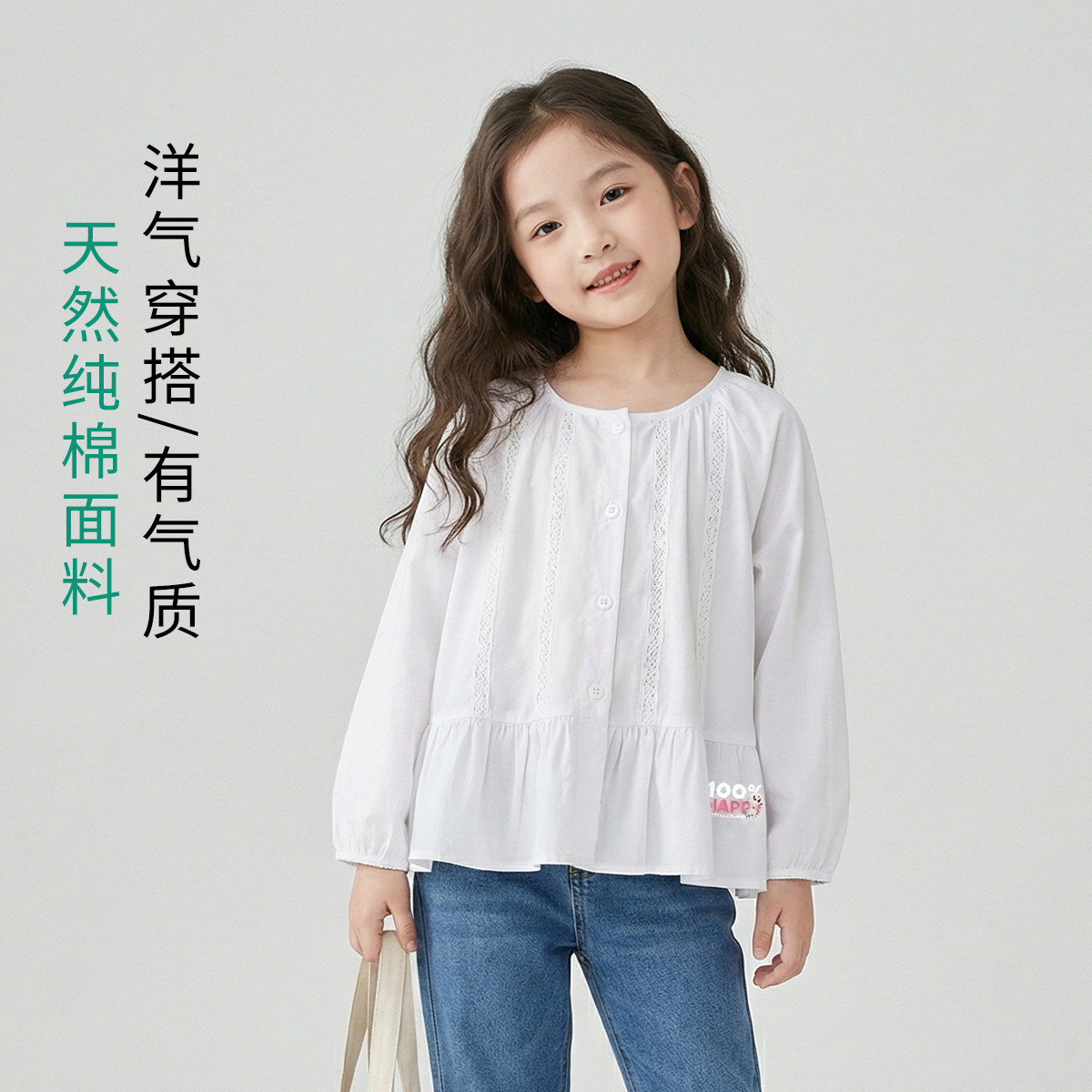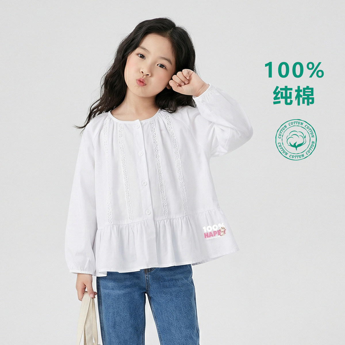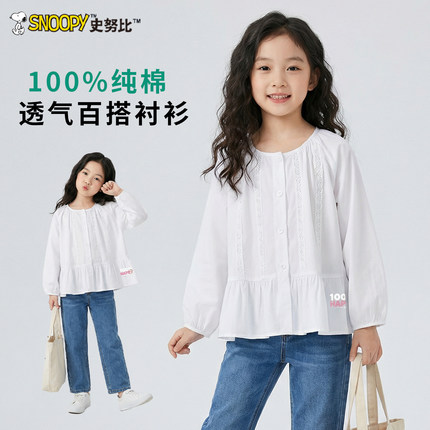 史努比女童春装纯色白衬衫2026新款宝宝纯棉衬衣儿童春秋长袖上衣