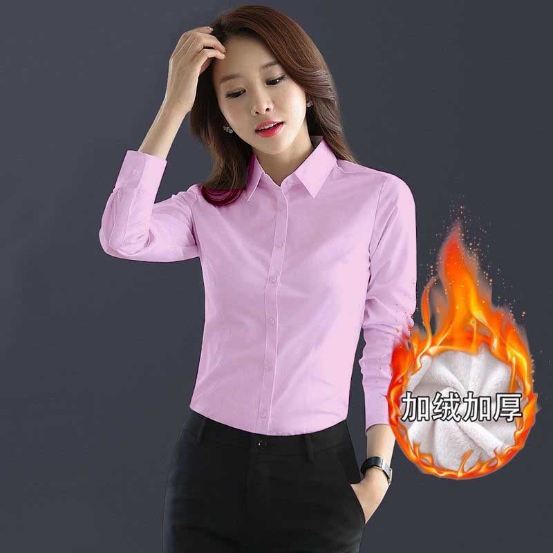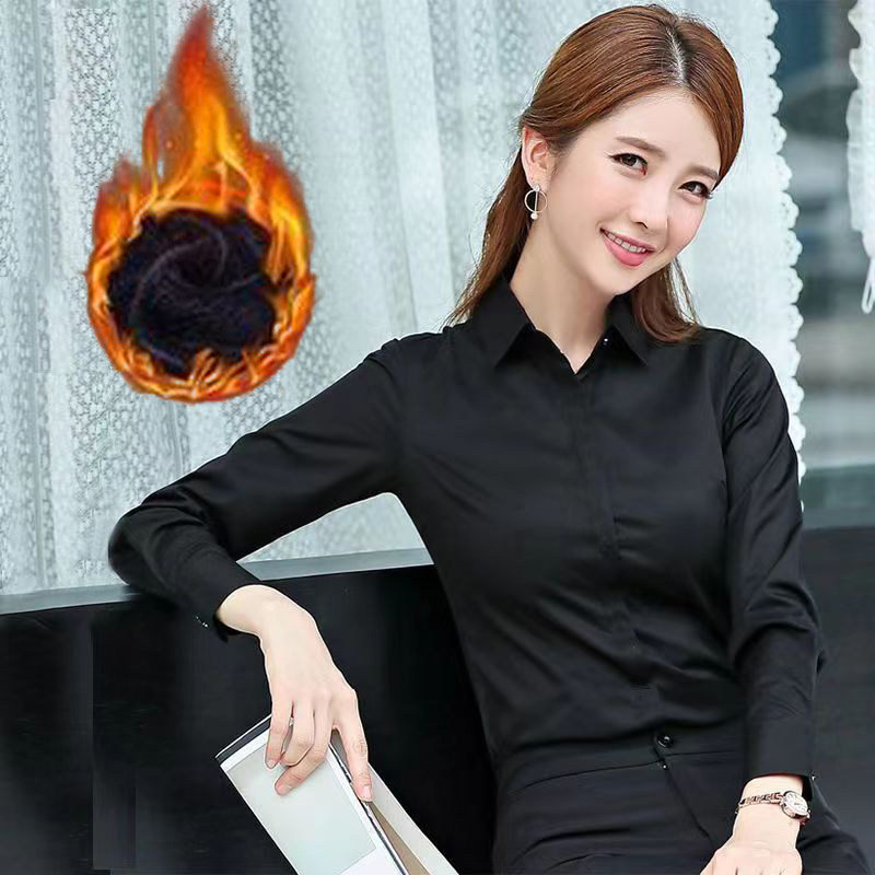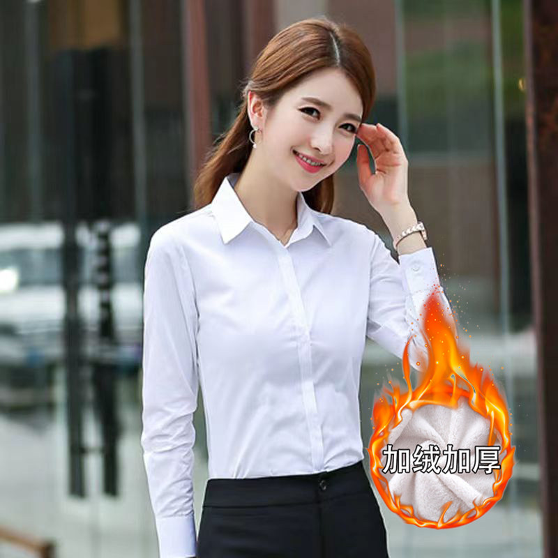 加绒加厚蓝色黑色白色女士衬衫女长袖秋冬正装修身大码职业衬衣女