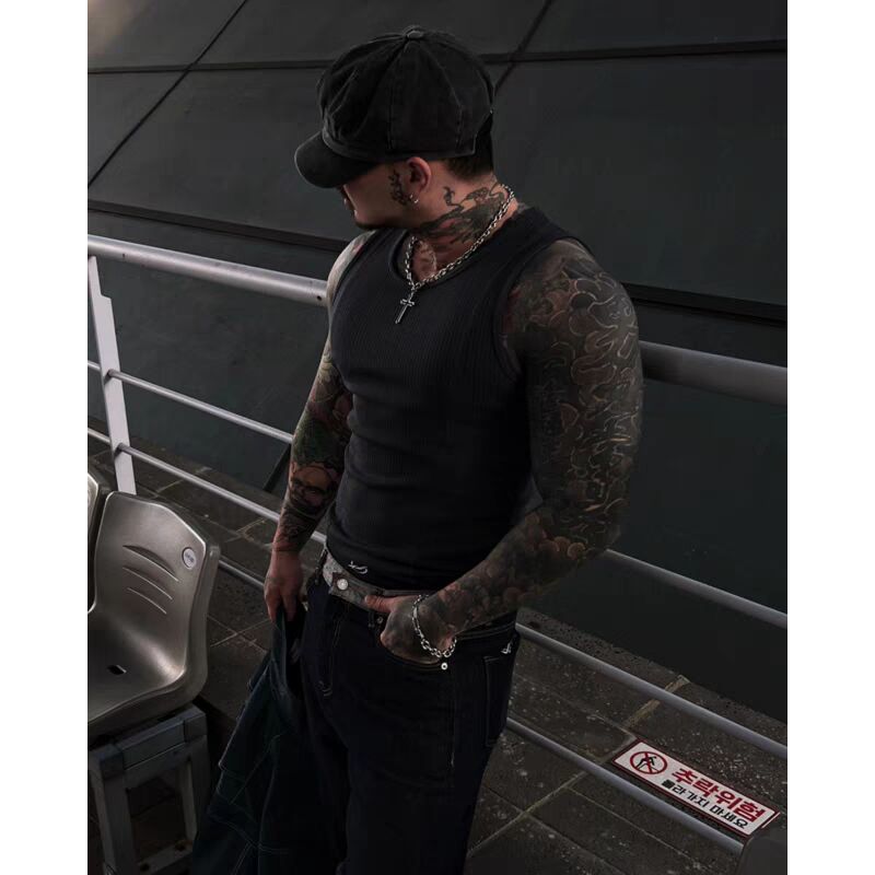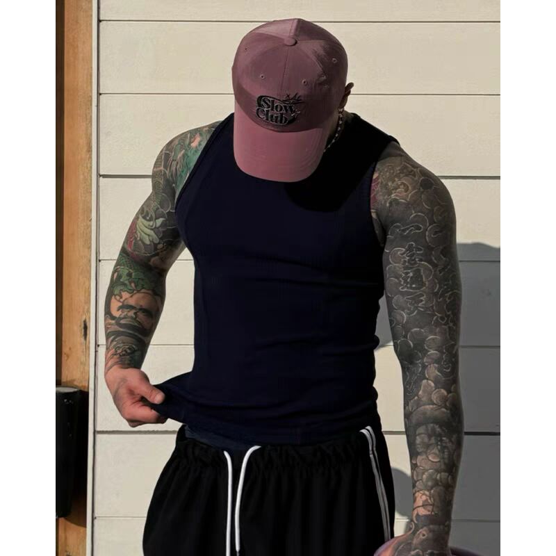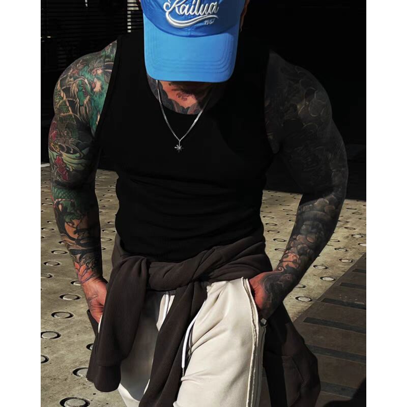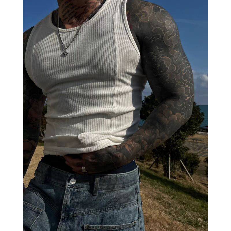 欧美硬汉纯棉螺纹背心肌肉男紧身高弹力无袖t恤拼接打底小坎肩潮