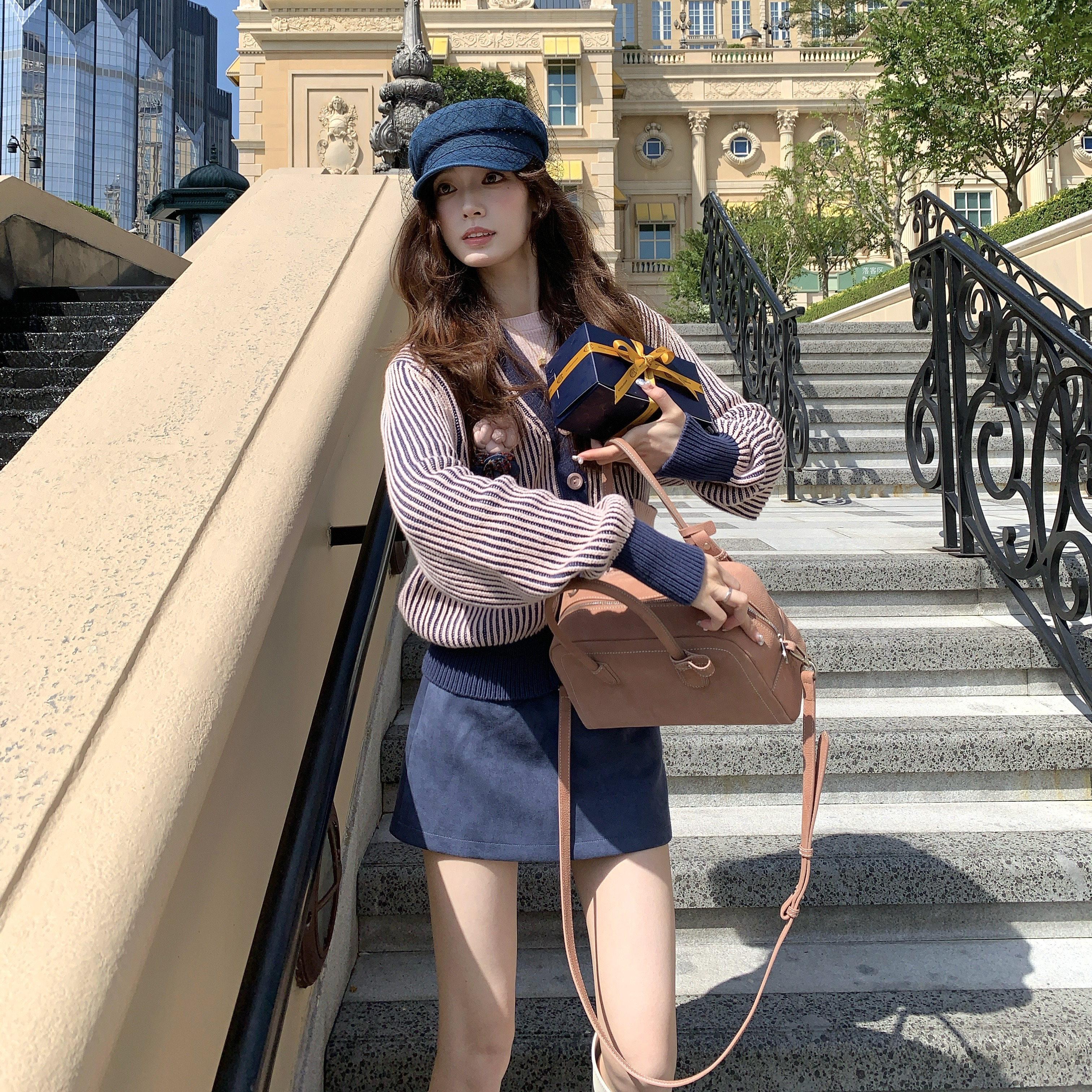 SourceWithU巴黎旧梦 60棉粉蓝高捻棉坑条针织开衫麂皮绒短裙套装