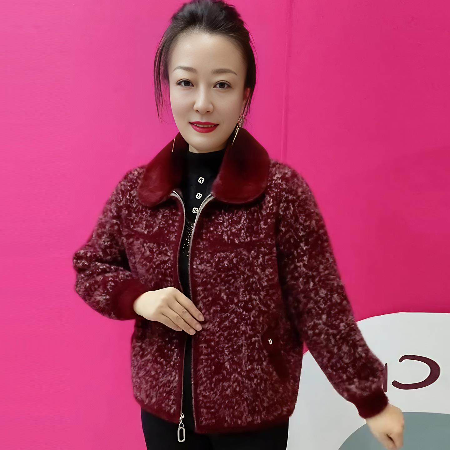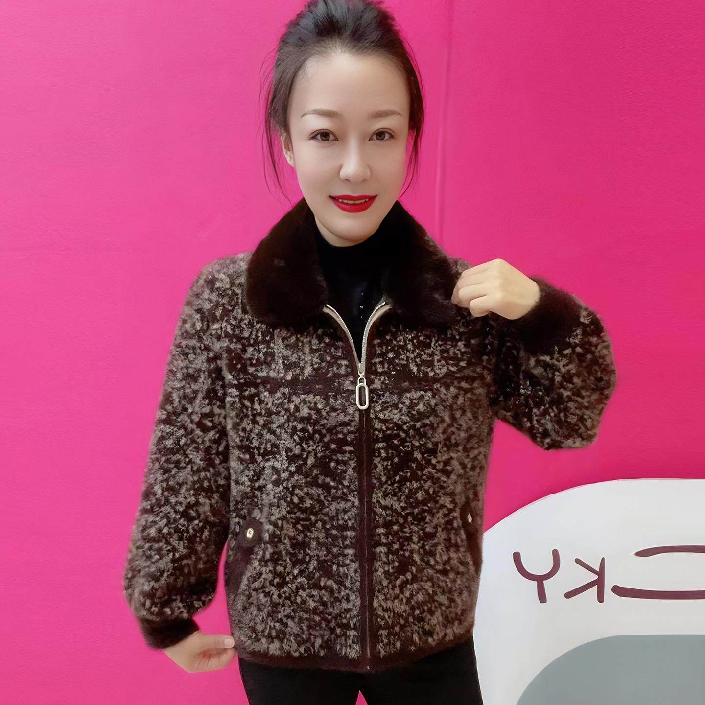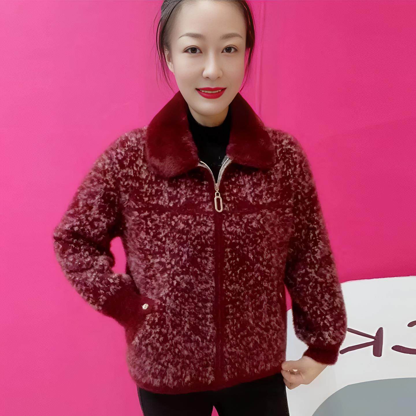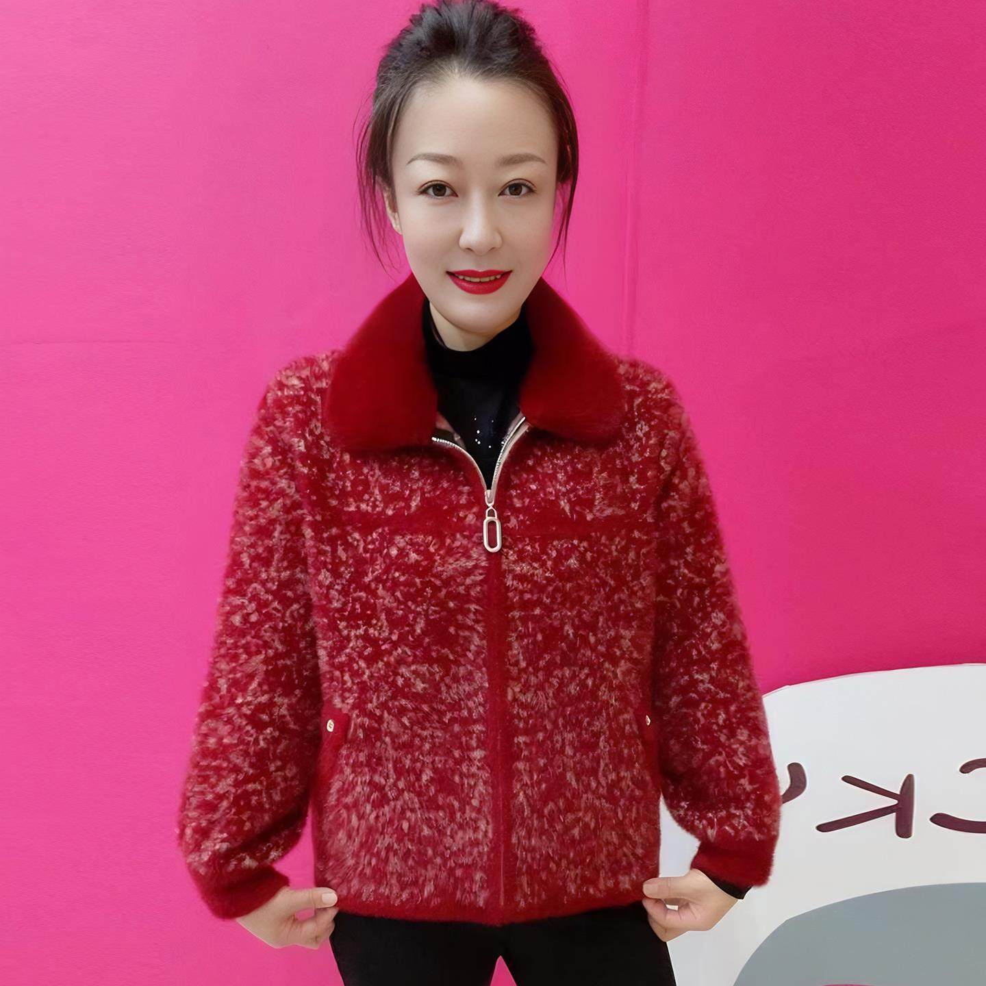 温暖风毛领拉链针织开衫女短款翻领中老年妈妈装秋冬金貂绒外套女