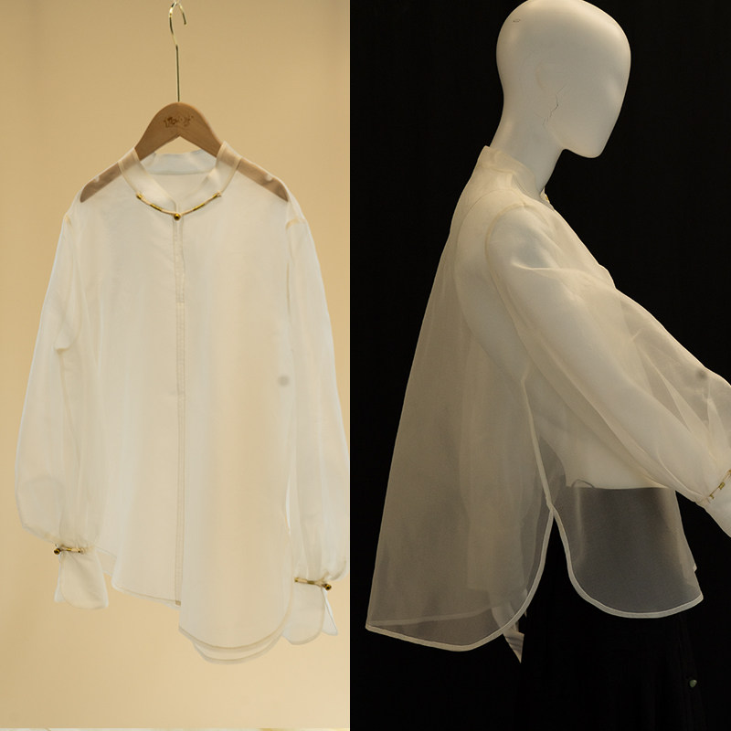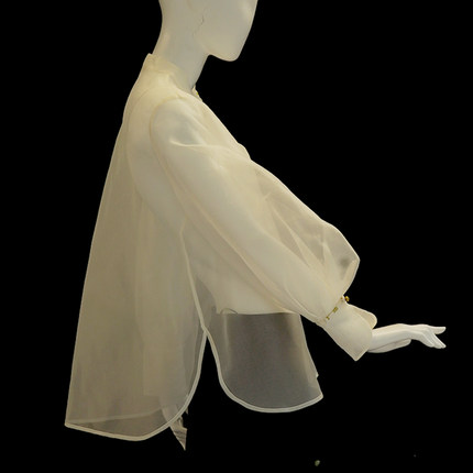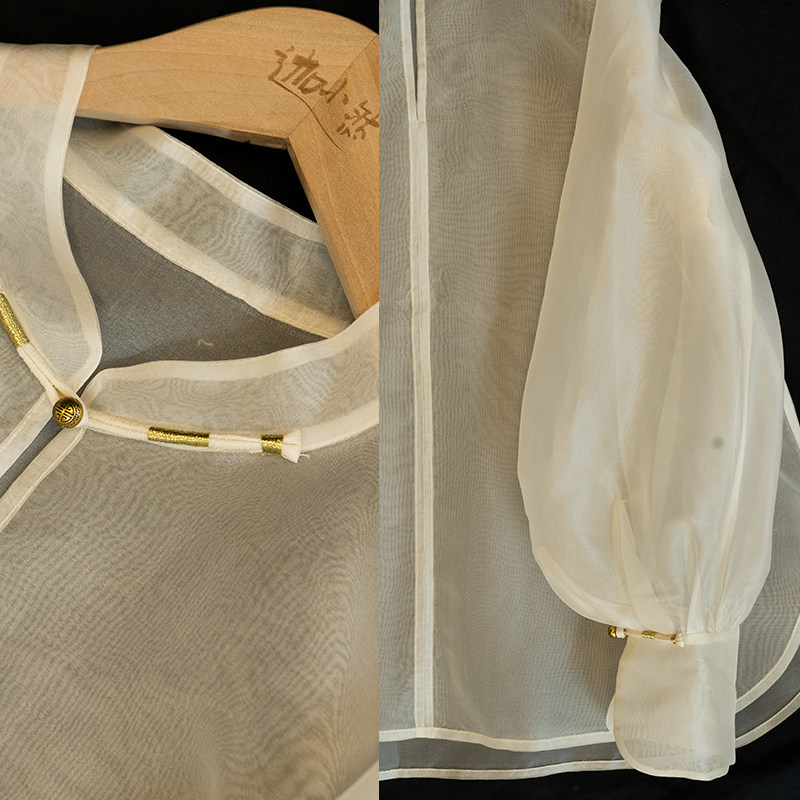 100%桑蚕丝生丝绡原创宽松版新中式国风立领泡泡袖打底衬衫