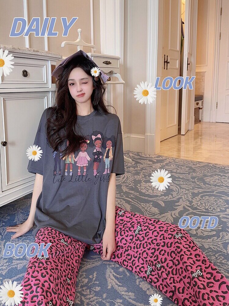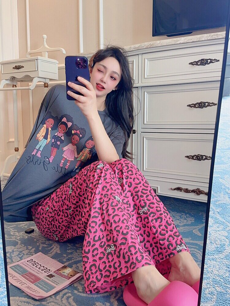 豹纹莫代尔睡衣女春夏季薄款短袖长裤纯棉大码两件套秋家居服套装