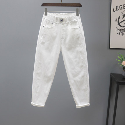 白色松紧腰休闲牛仔裤子女2026春秋百搭宽松九分哈伦裤老爹萝卜裤