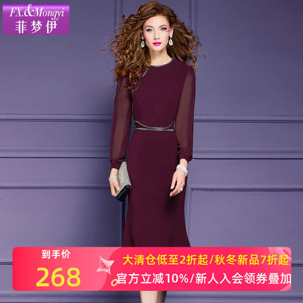 菲梦伊纯色连衣裙女长袖秋季新款法式轻熟高级感修身气质鱼尾裙子