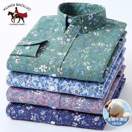 保罗100%纯棉男士碎花长袖衬衫中青年全棉牛津纺大码印花衬衣男装