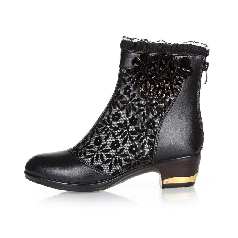春秋季平底短靴真皮女靴蕾丝镂空镶钻网靴粗跟中跟短筒大码凉靴子