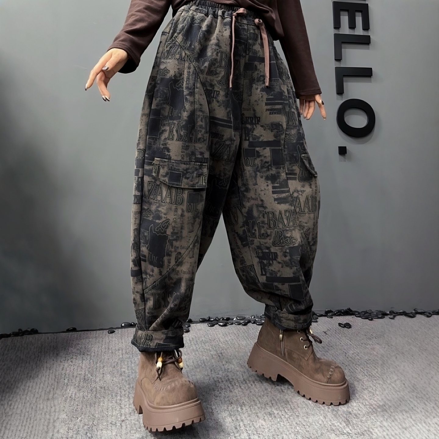 欧版个性印花加绒加厚牛仔裤女2025冬季松紧腰宽松显瘦九分哈伦裤