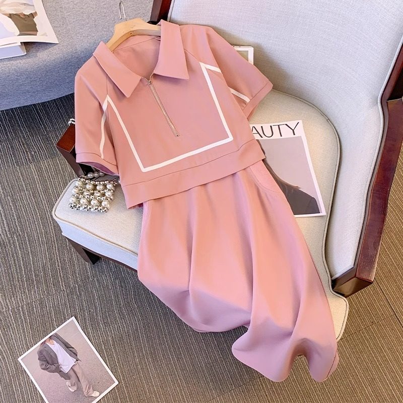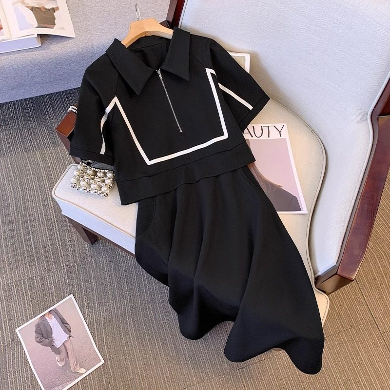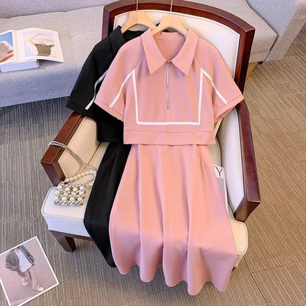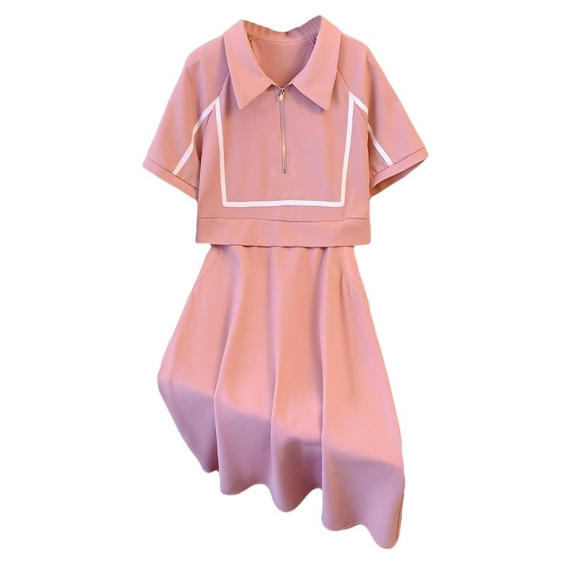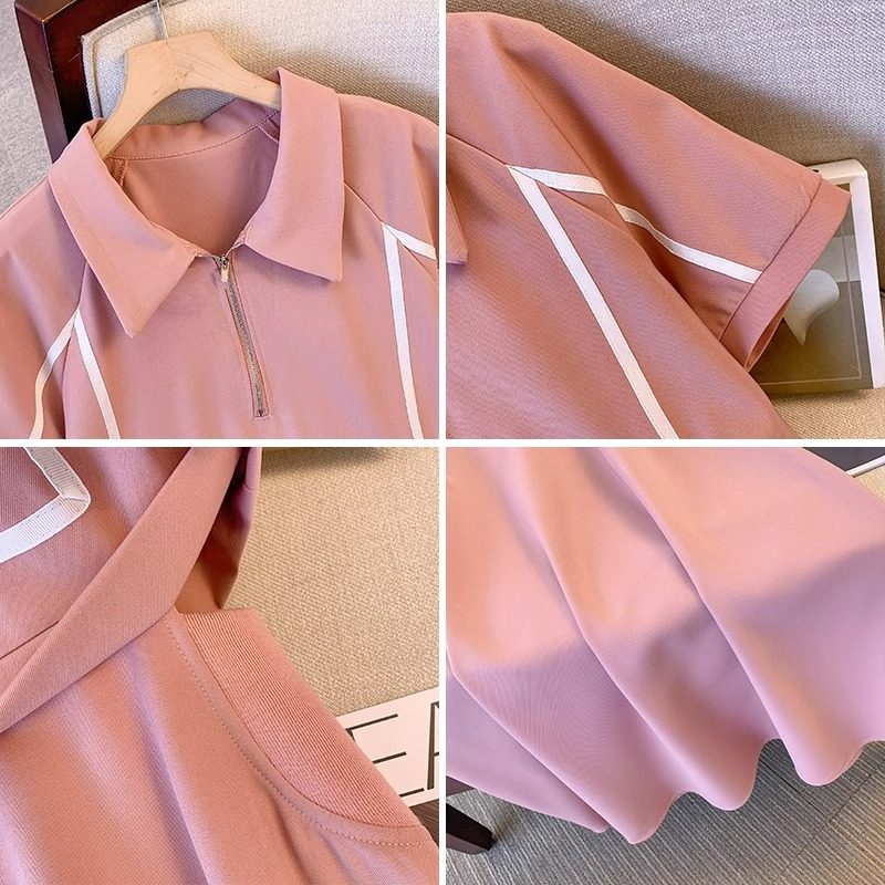 假两件拼接Polo领连衣裙女2024夏季时尚气质宽松大码短袖中长裙潮