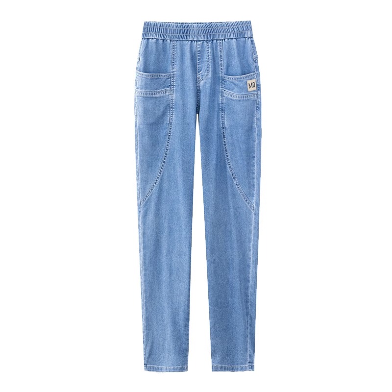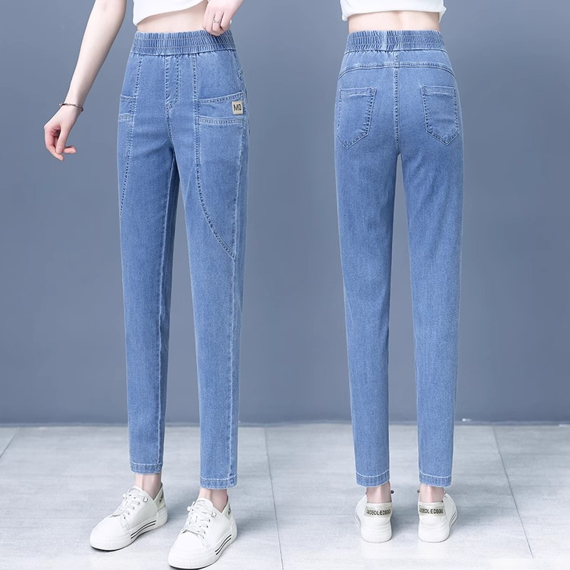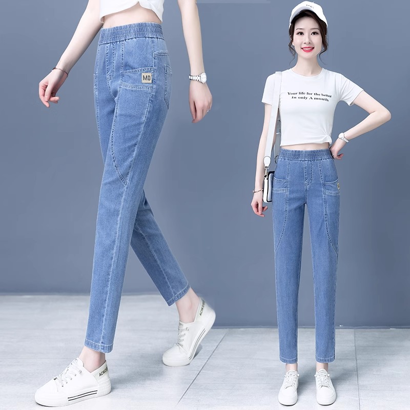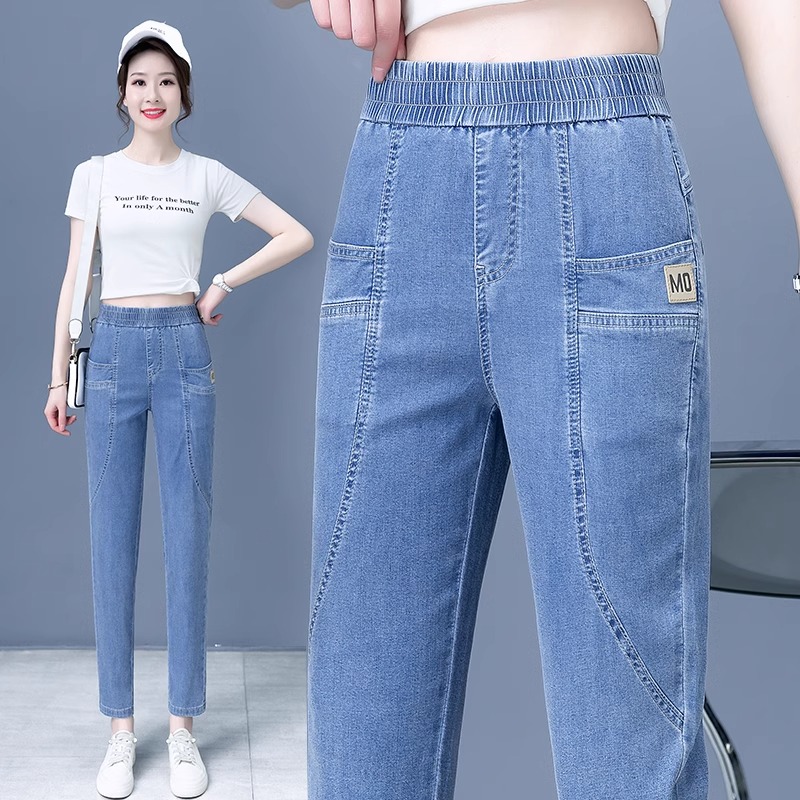 秋季薄款松紧腰天丝牛仔女裤2025哈伦九分休闲哈伦裤梨形身材裤子