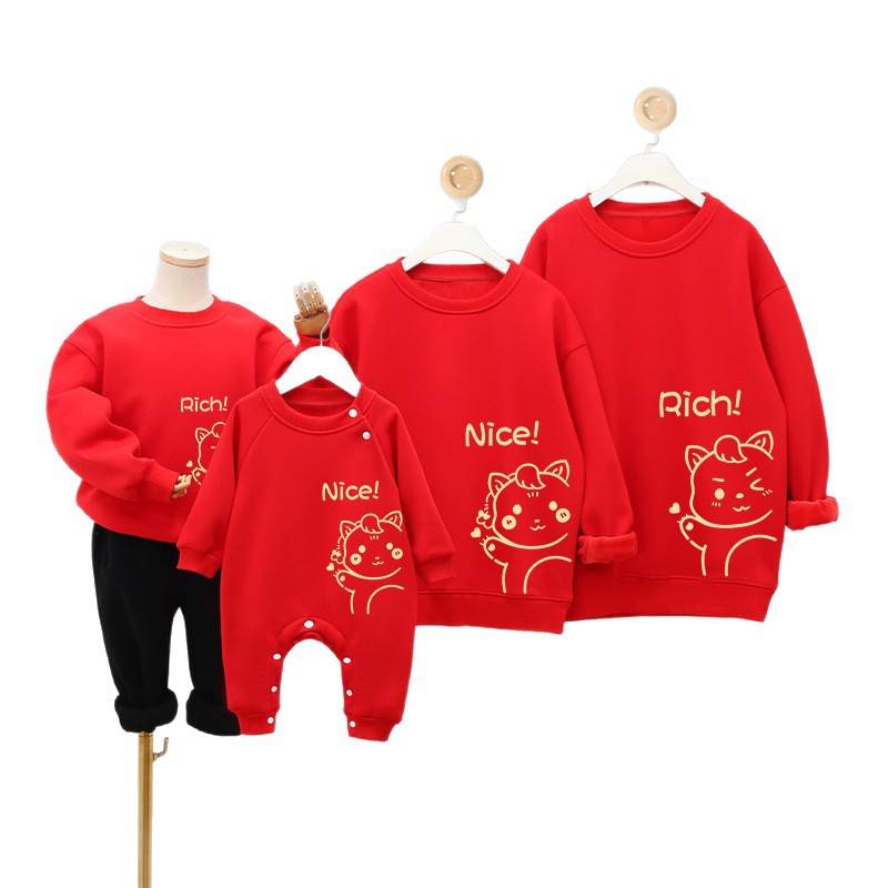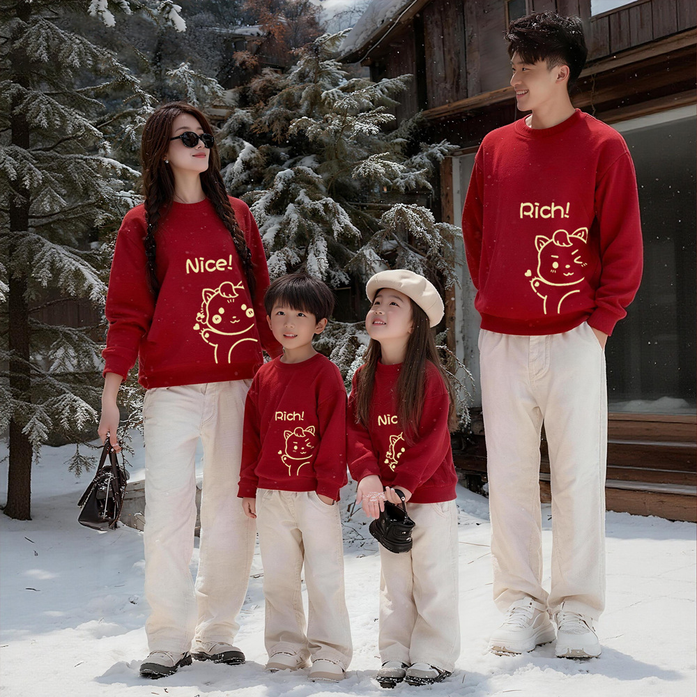 马年新款亲子装卫衣一家三四口全家福红色高级感母子母女装童卫衣