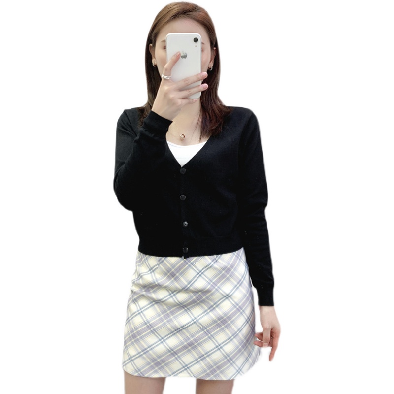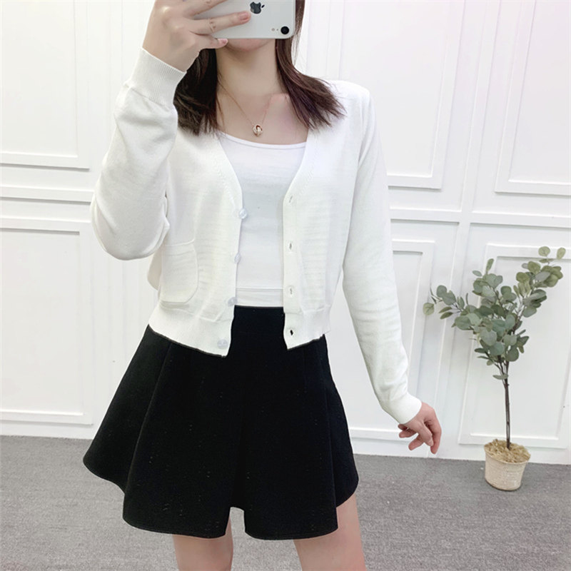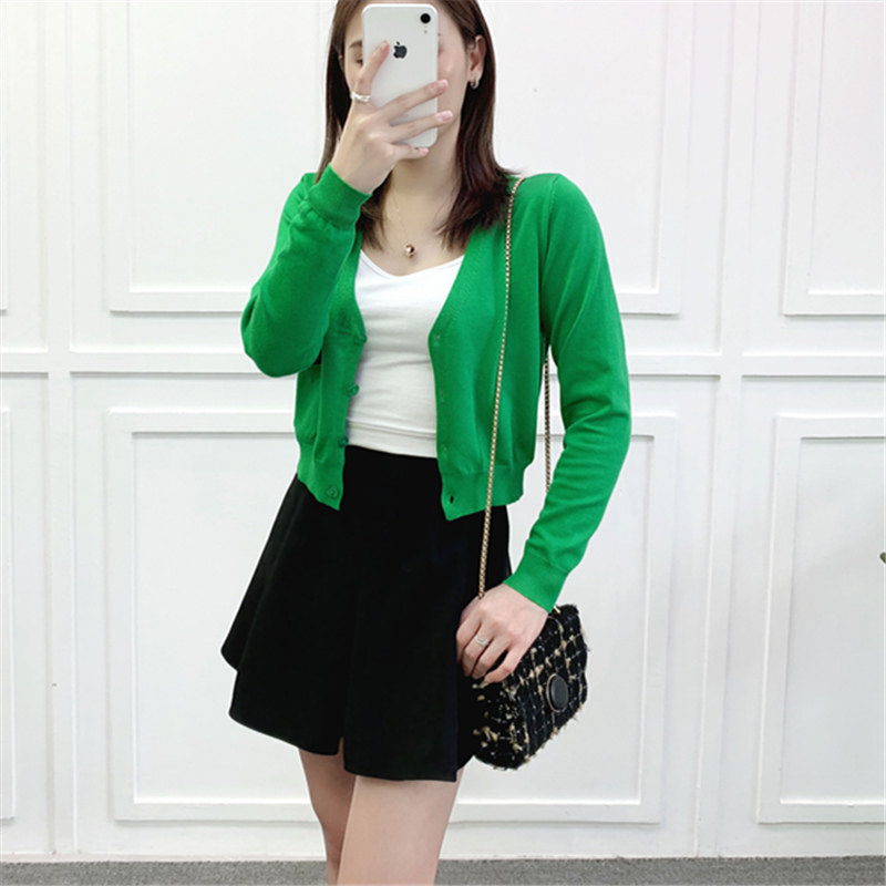 春秋季超短款V领修身薄针织衫女开衫高腰毛衣小外套披肩外搭上衣