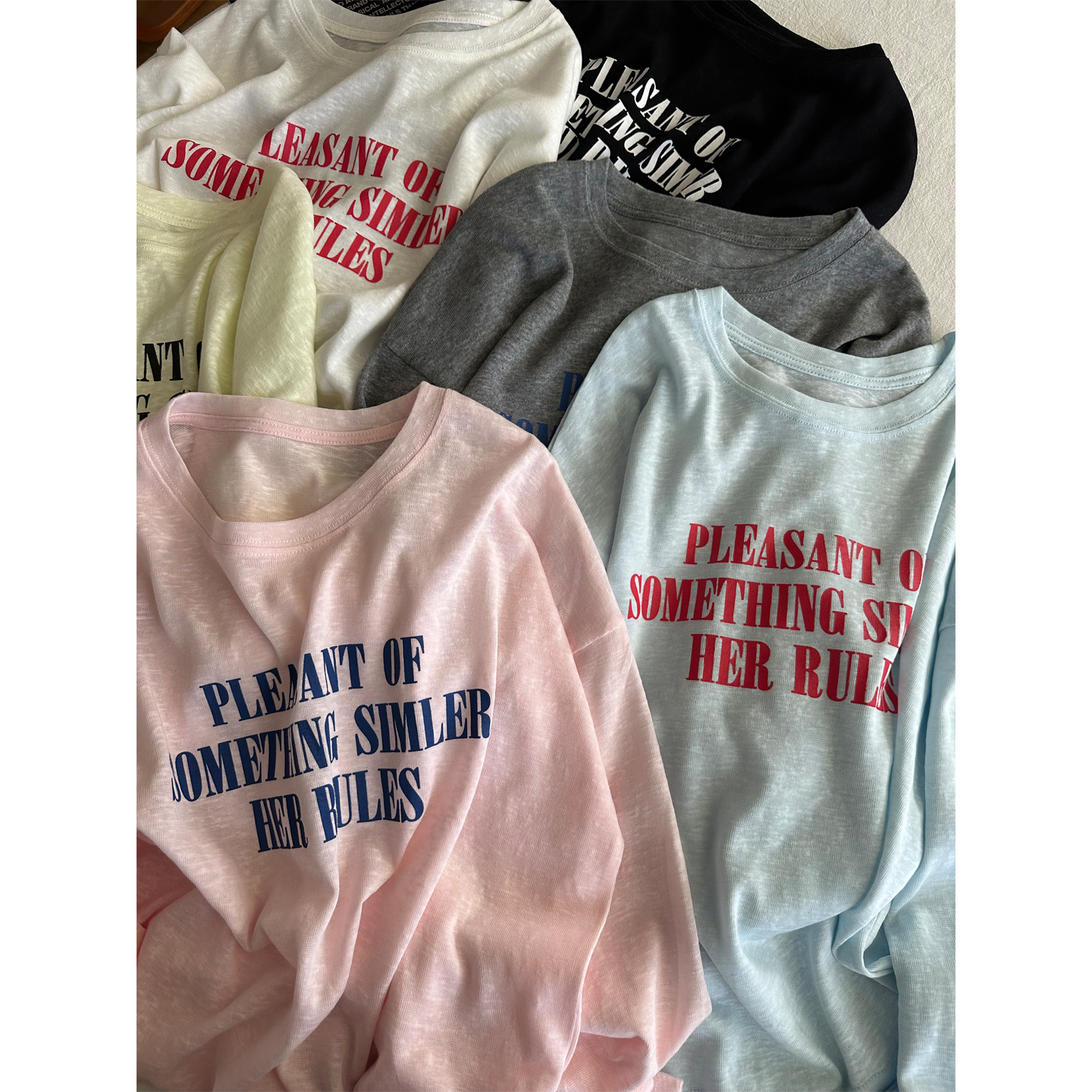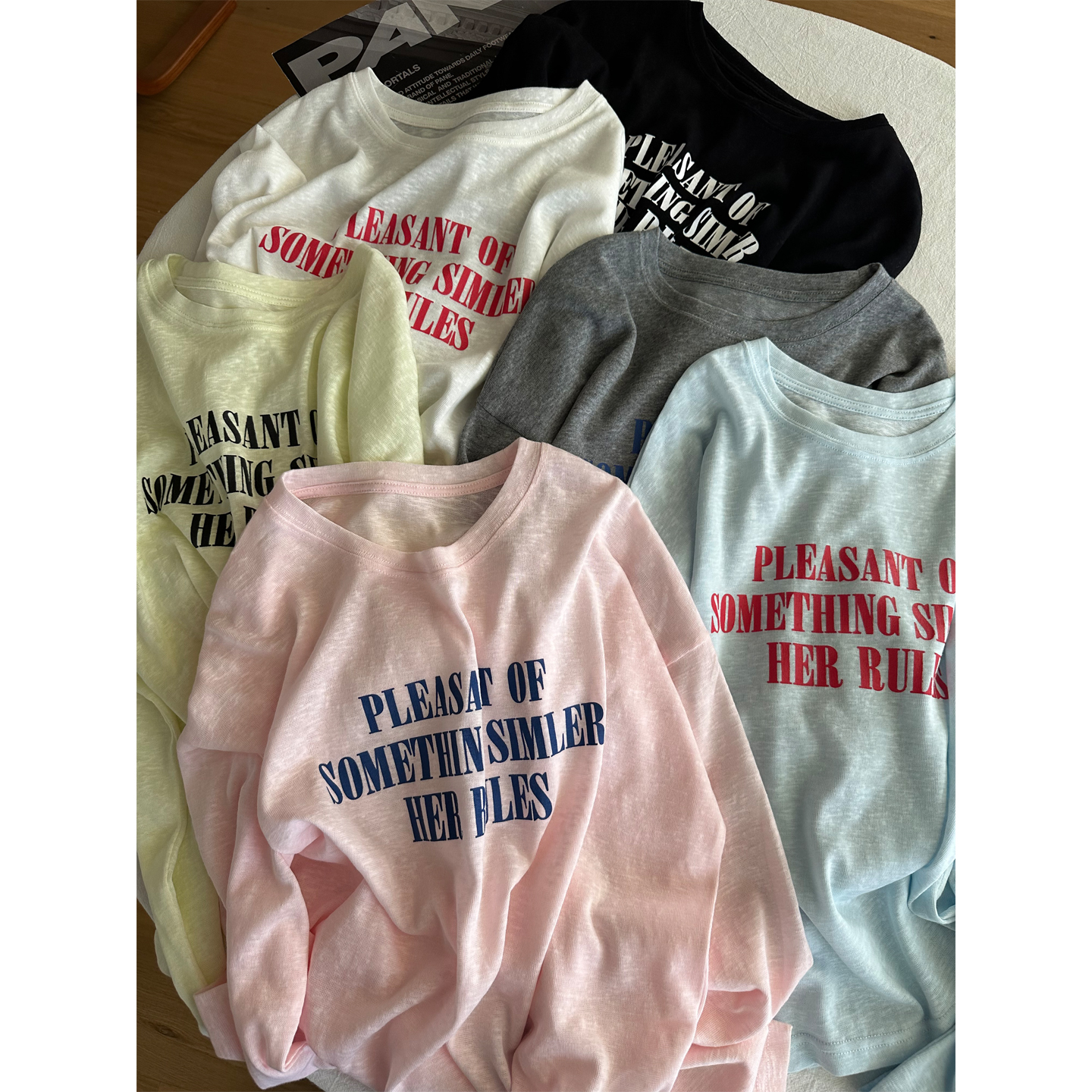 韩系麻感棉透气韩版字母印花长袖T恤女宽松显瘦薄款防晒空调罩衫
