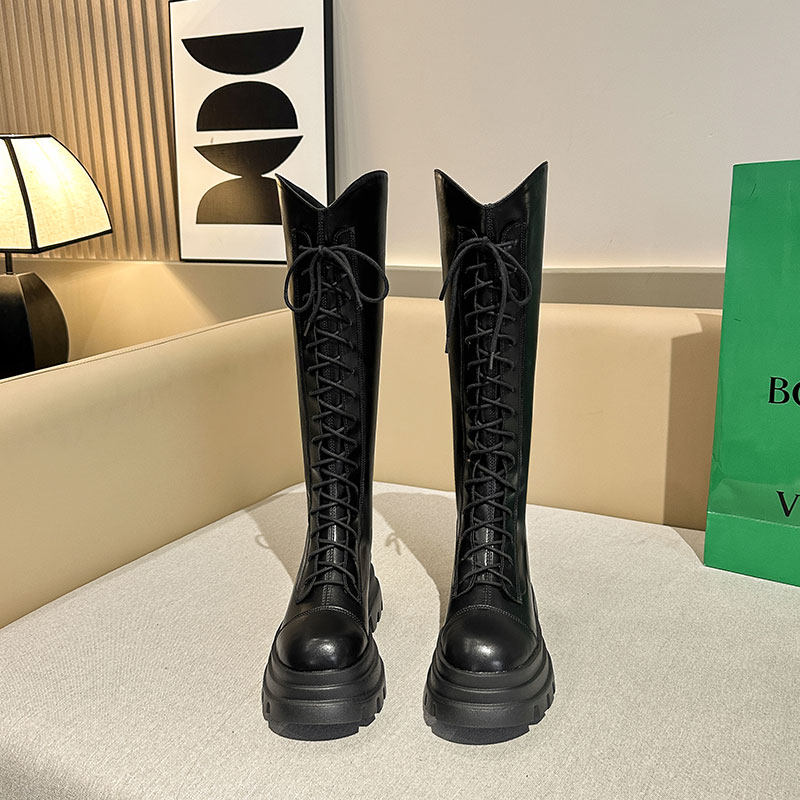 六点大叔 真皮长筒靴女2023秋冬季V口百搭粗跟厚底高筒长靴骑士靴