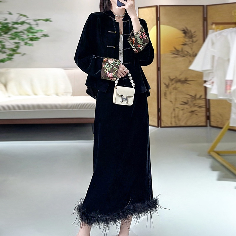 美伦两件套2025新中式唐装刺绣真丝绒百搭外套鱼尾半身裙长裙套装