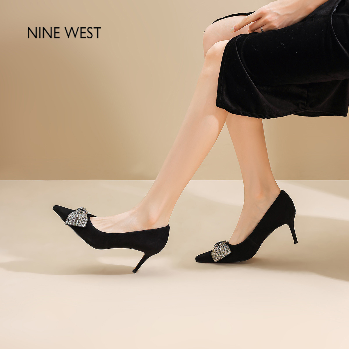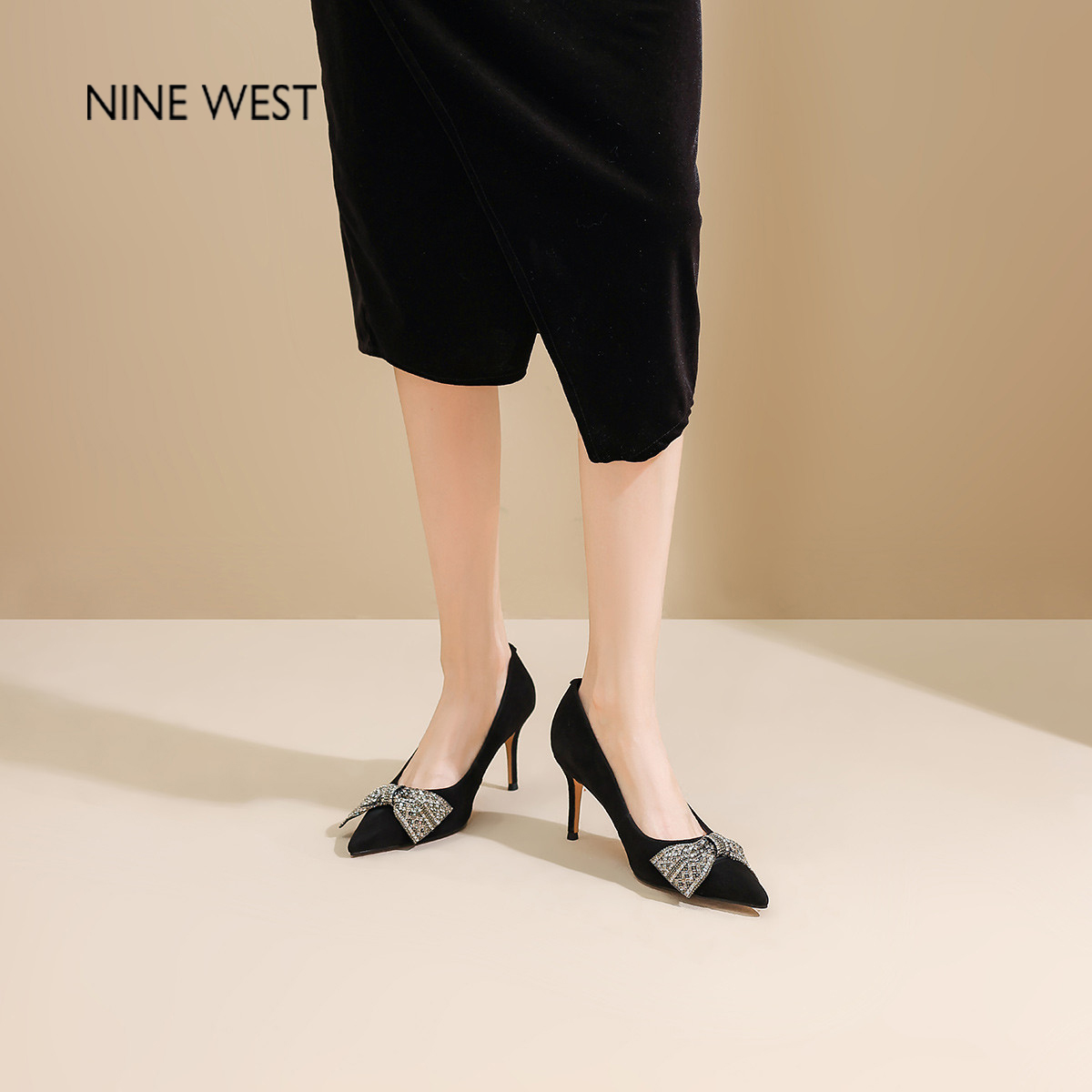 Nine West/玖熙2025年秋季新款蝴蝶结高跟鞋女细跟尖头水钻单鞋女
