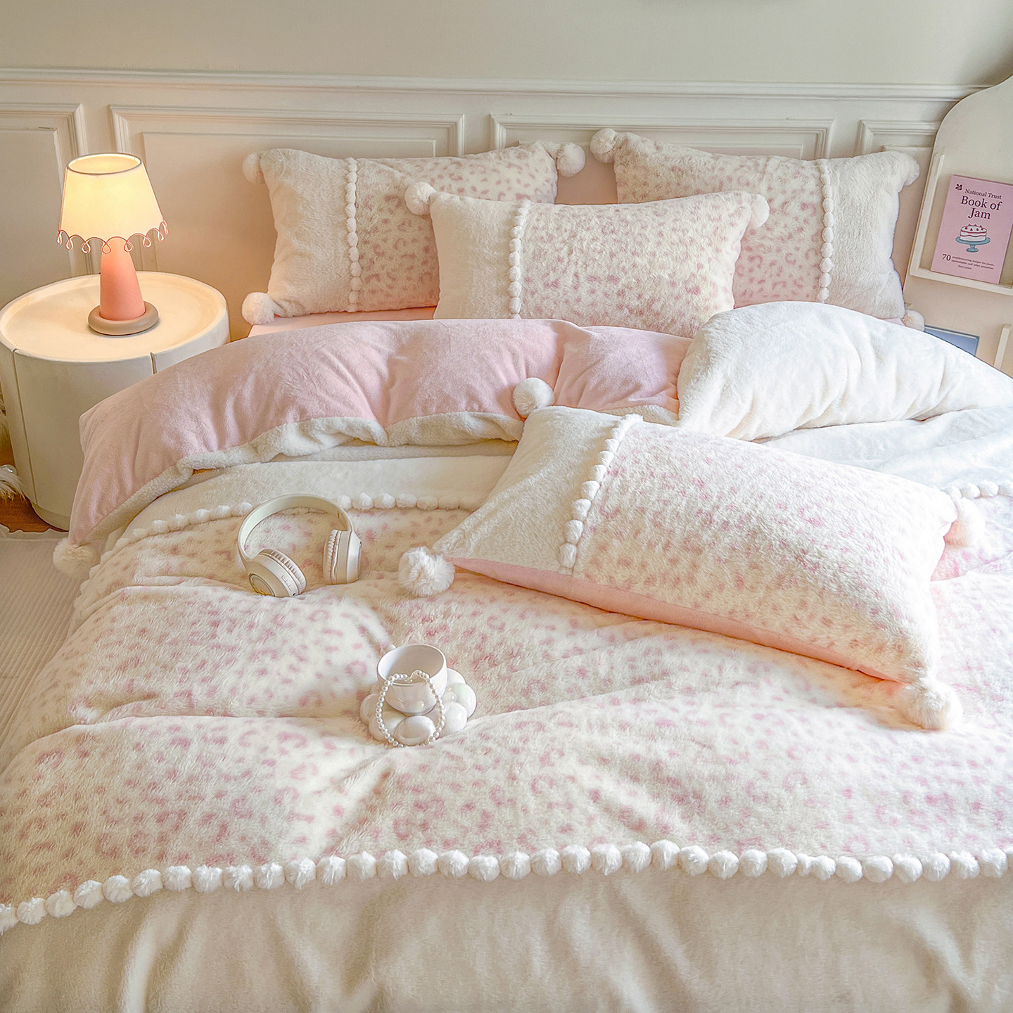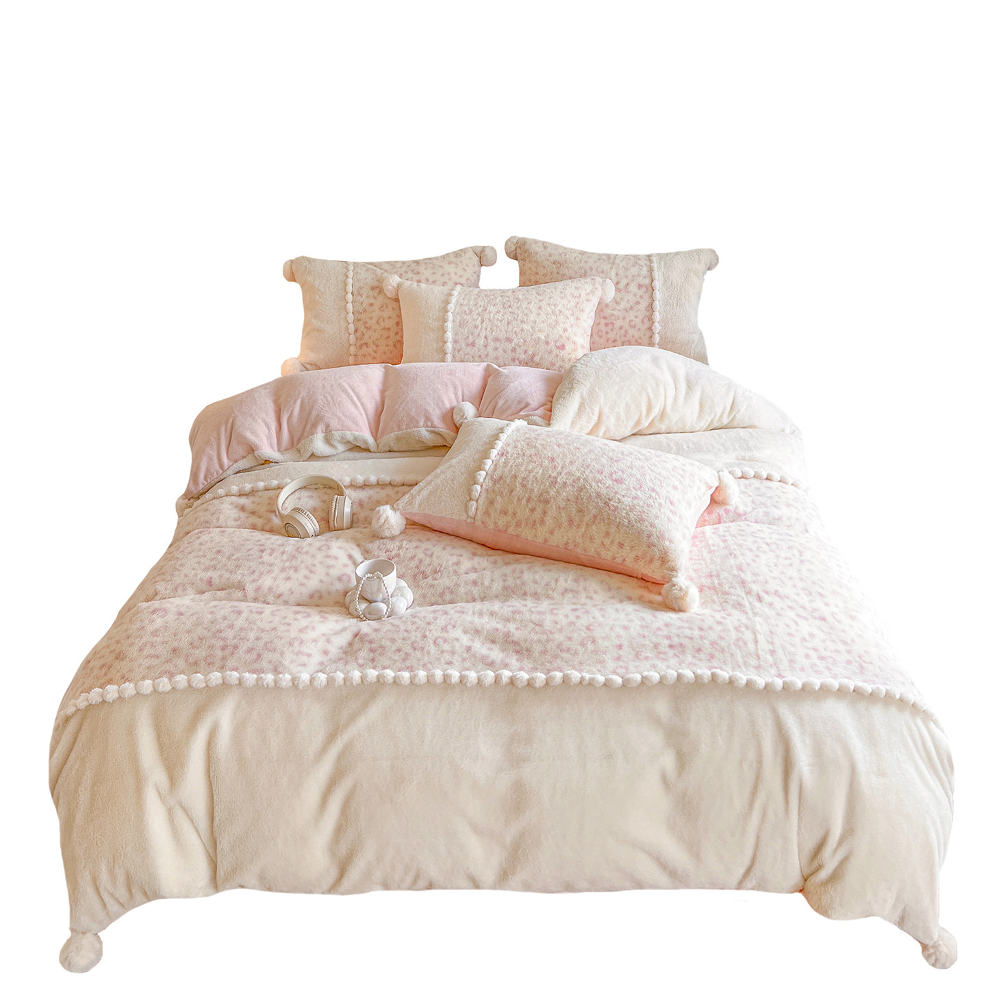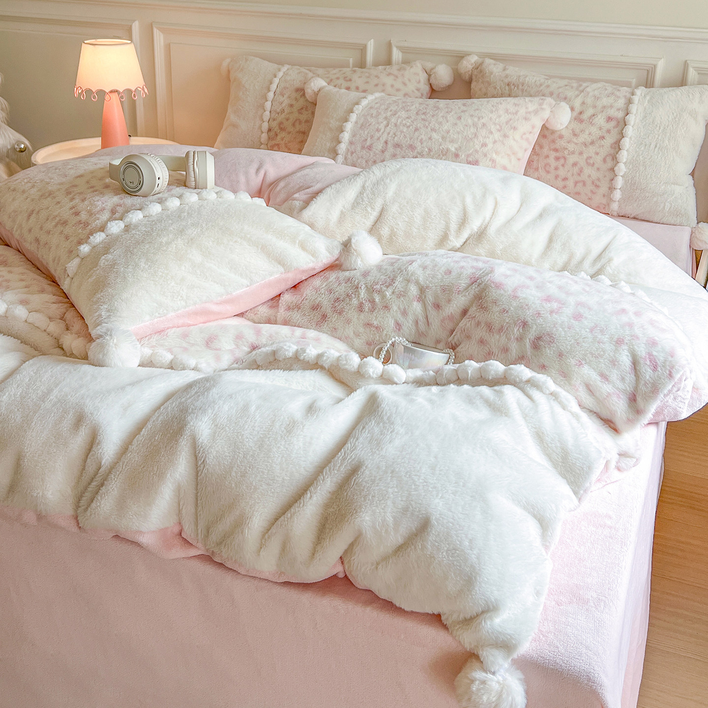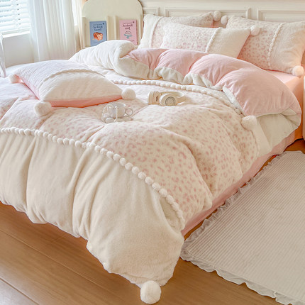 冬季少女兔兔绒牛奶绒四件套公主风珊瑚绒双面绒毛球被套加厚床单
